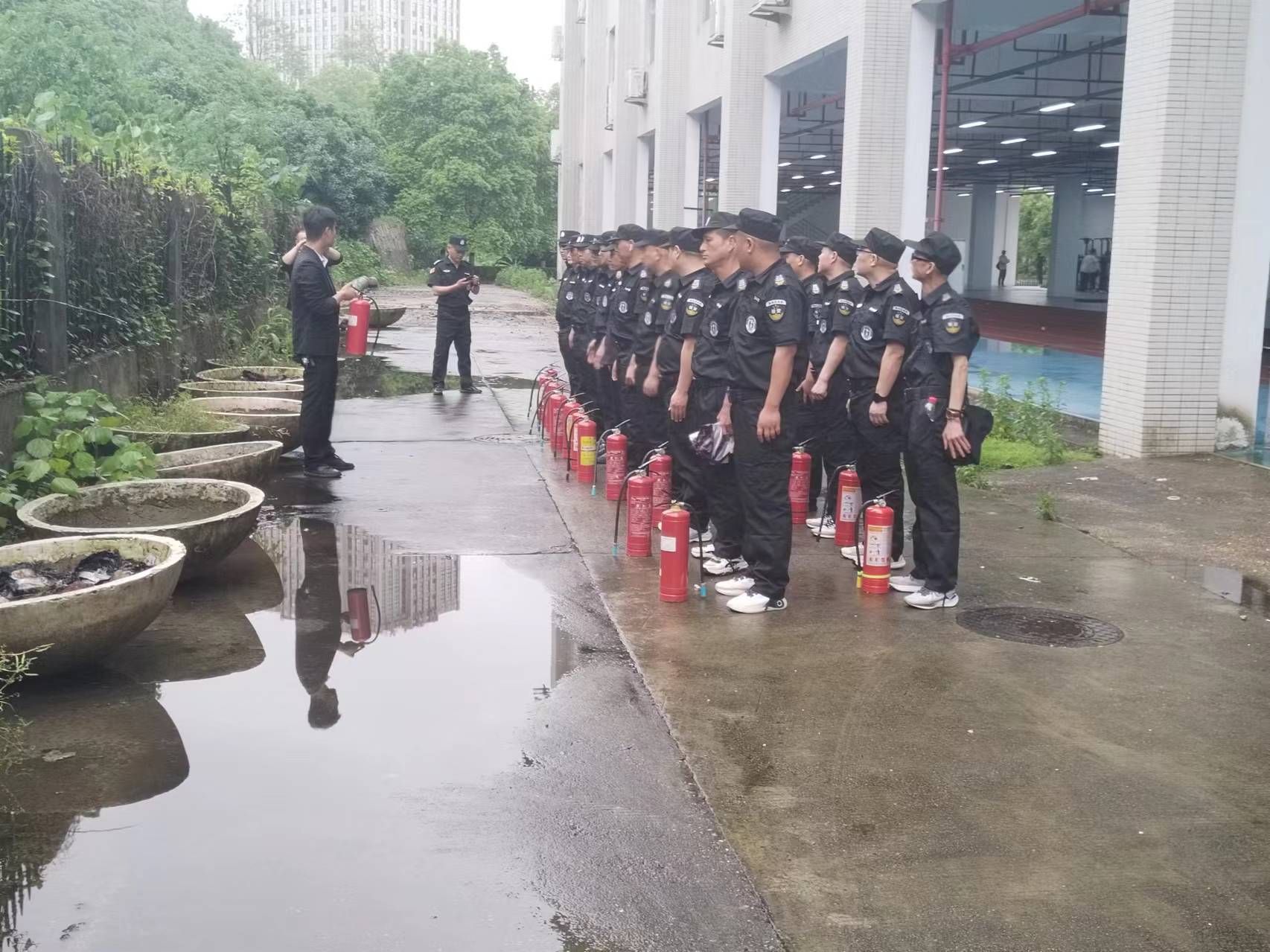 会后,全体保安在体育馆负一楼北侧空坪处进行灭火器实践操作演练,以提升每位安保人员正确使用灭火器扑灭初期火灾的基本能力。
