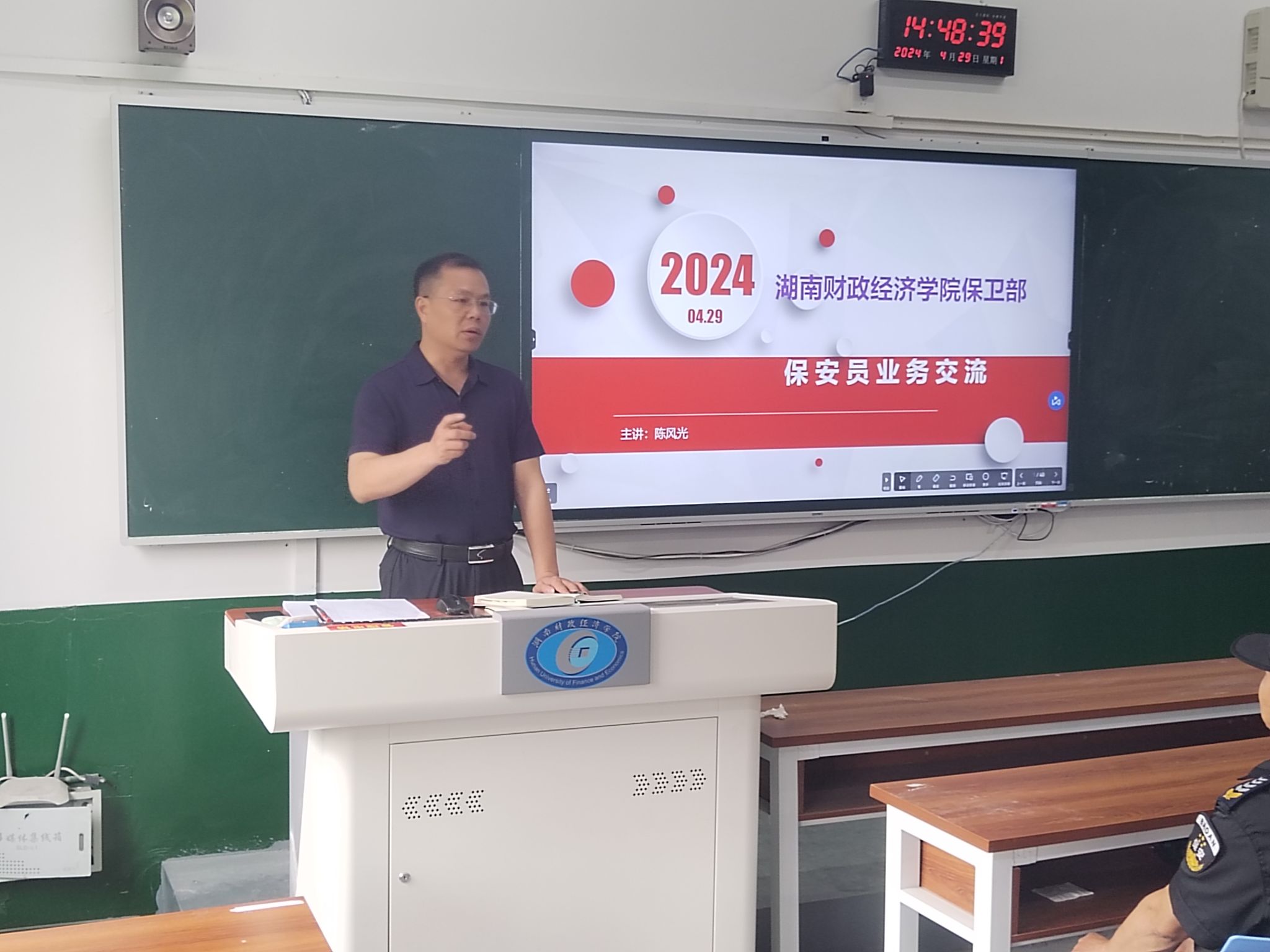 4月29日下午,保卫部在一教405多媒体教室对即将入驻学校的中保恒杰保安公司所有保安人员开展入岗前业务培训工作。