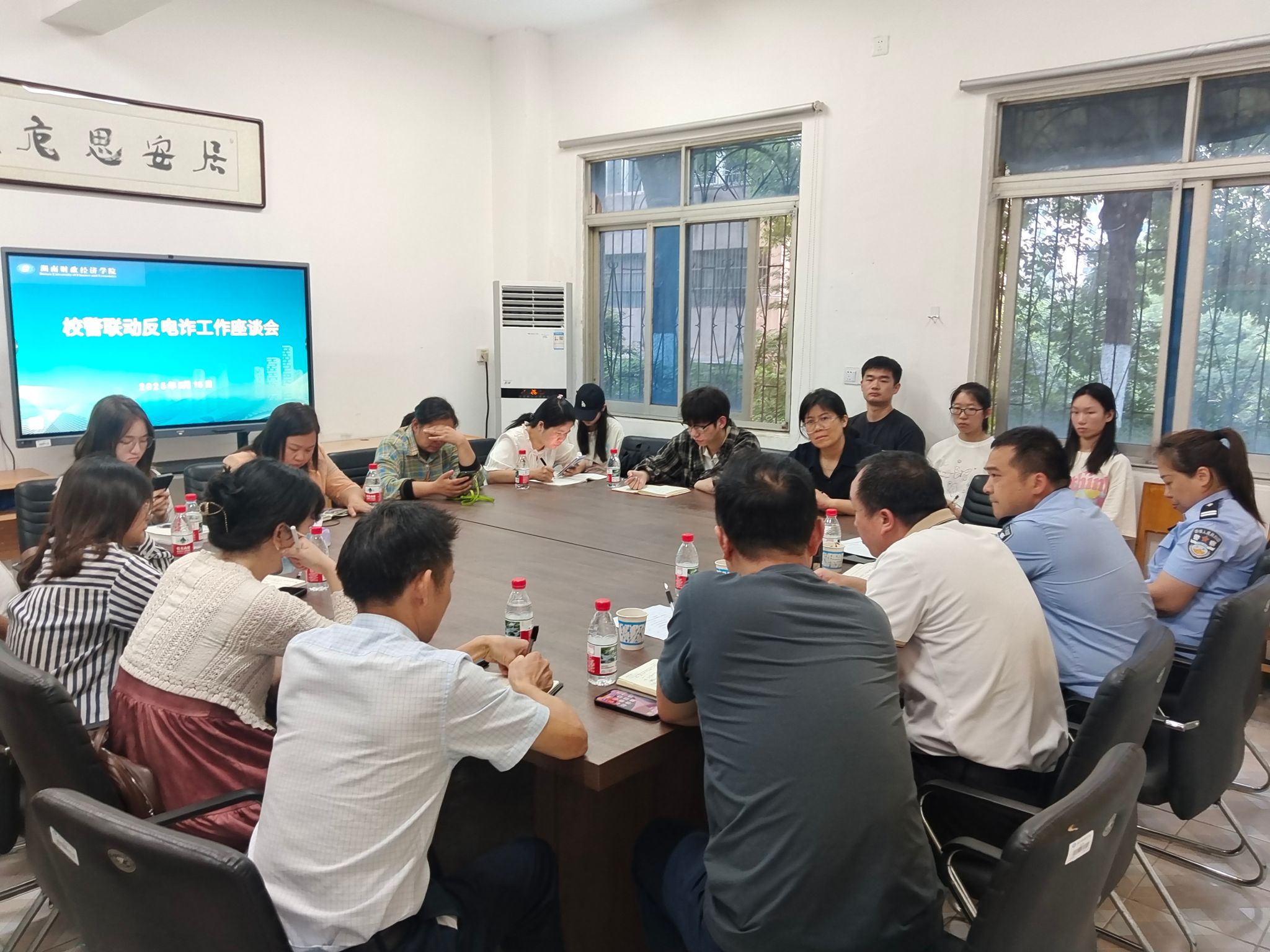 为有效遏制电信网络诈骗案件在校园内发生,切实保障师生财产安全。2025年5月15日,学校保卫部与咸嘉湖派出所联合召开反电诈工作座谈会。保卫部副部长陈风光、咸嘉湖派出所副所长陈春红,以及相关学院辅导员和学生代表参与座谈。