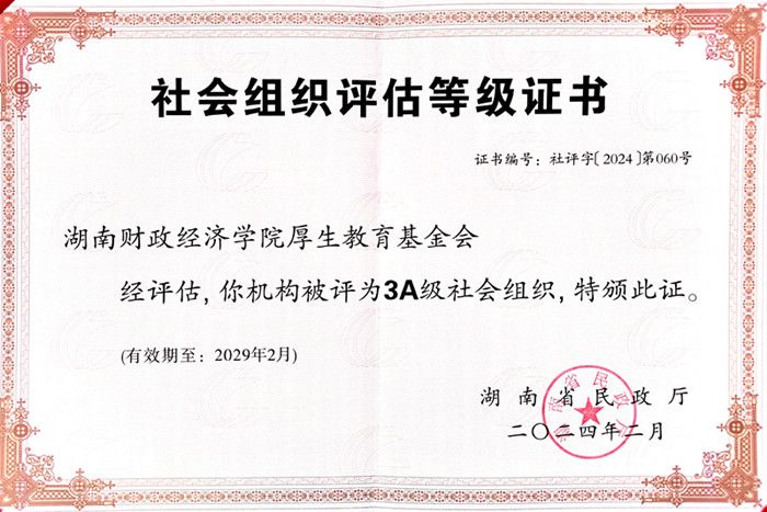 近日,湖南省省级社会组织评估等级授牌会在长沙召开,为获评2023年度3A及以上等级的省级社会组织授牌。在各级领导的关心下、在广大校友和社会各界爱心力量大力支持下,best365中国官方网站厚生教育基金会为获评3A级社会组织之一。省民政厅党组成员、副厅长廖国核等领导为获评单位授牌。