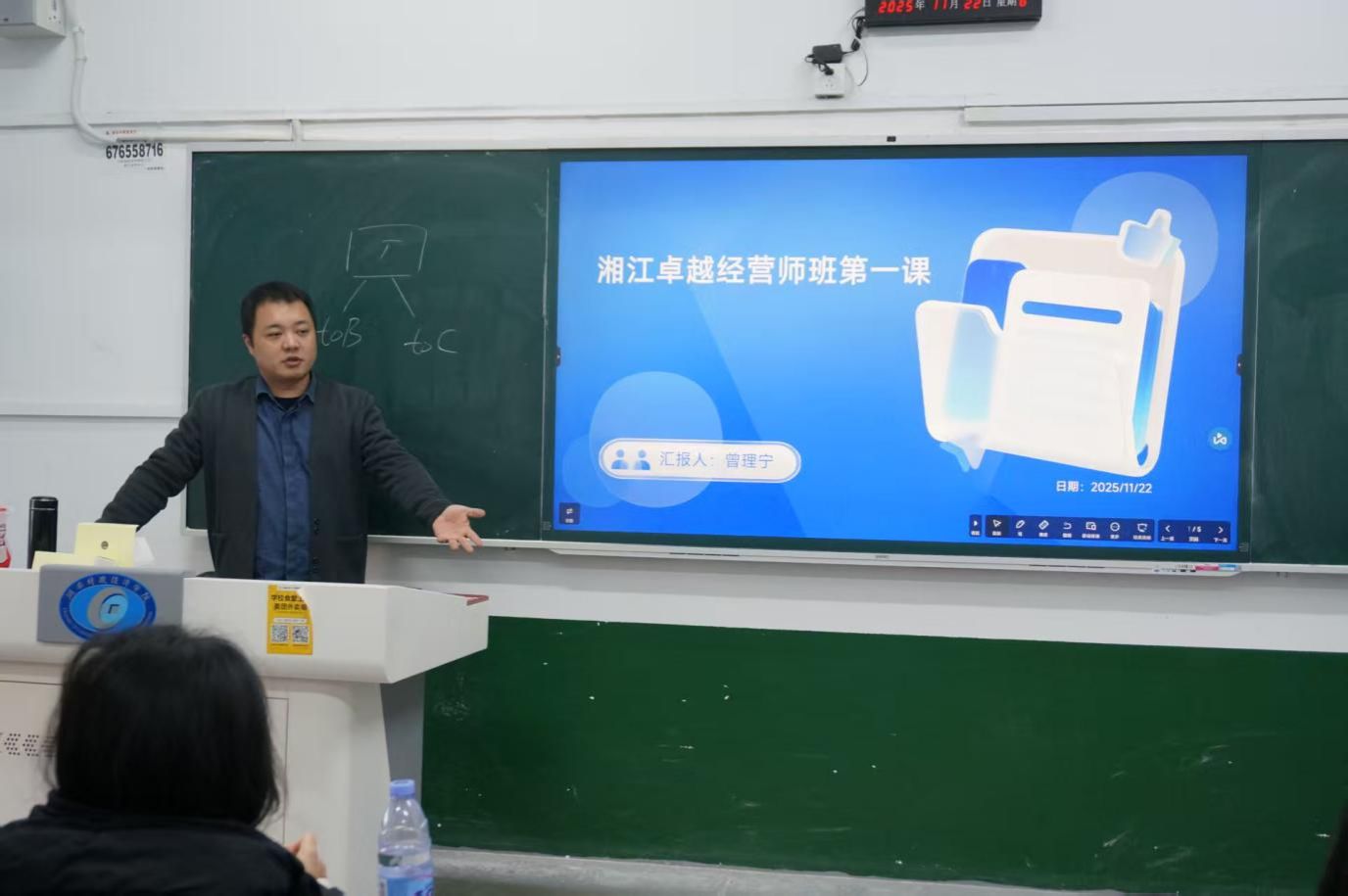 (本网讯)2025年11月22日上午,“湘江卓越经营师”班正式开课。本次课程由创新创业与人工智能学院副院长曾理宁主讲,围绕创新创业能力培养、就业与创业衔接、市场认知等关键话题,结合其两次创业实战经历与电商、AI 行业前沿分析,为怀揣创业梦想的参与者带来了一堂兼具启蒙性与实操性的干货课程。