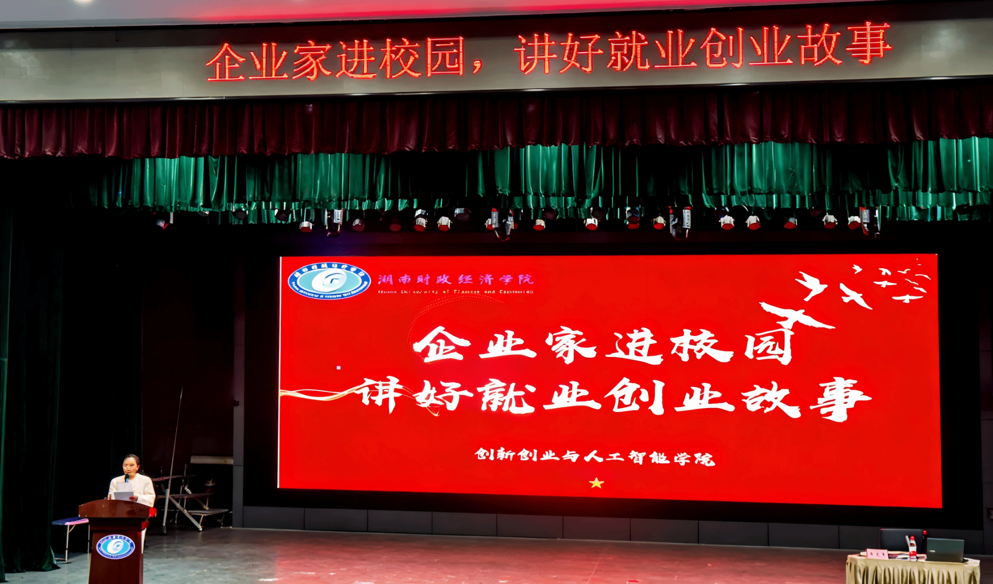 为深化校园双创教育与产业实践的衔接,激发学生创新思维与创业热情,2025年12月17日,创新创业与人工智能学院于大礼堂举办“创意破局 IP 赋能——湖南广电文旅项目商业模式创新之路”创业基础课程专题讲座。学院副院长胡小梅、大学生创新创业指导教研室主任周雪出席活动,本次讲座特邀湖南夜经济研究专家库成员、湖南芒果文旅投资有限公司招商管理部负责人李天勇先生担任主讲嘉宾。