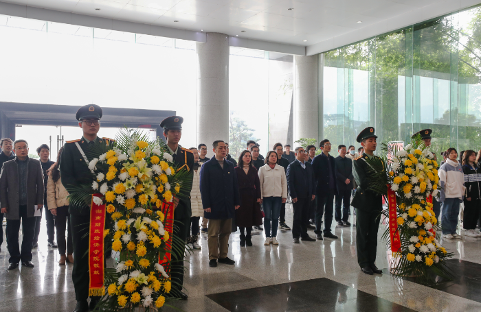 (本网讯)12月26日上午,学校在办公楼大厅举行“毛泽东同志诞辰127周年”纪念仪式。仪式现场在庄严的国歌声中,仪式拉开序幕。党委书记肖湘愚代表全校师生敬献花篮并仔细整理花篮上的缎带,全体人员向毛主席铜像...