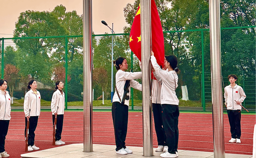 伴随着雄壮激昂的《义勇军进行曲》,五星红旗冉冉升起、迎风舒展。全体师生肃立注目,神情庄重,齐声高唱国歌,嘹亮的歌声在操场上方久久回荡。这一刻,爱国情怀在每个人心中激荡,大家用最真挚的情感表达着对祖国母亲的无限热爱与深切祝福。