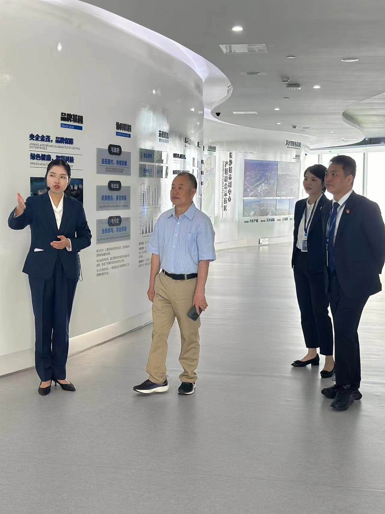 在金茂物业的精心安排下,刘茂盛一行首先参观了企业展厅,详细了解了金茂物业的发展历程、企业文化以及在物业管理领域的专业成就和创新实践。对企业展示的专业性和创新性表示高度赞赏,并认为这些经验对于高校教育具有重要的借鉴意义。