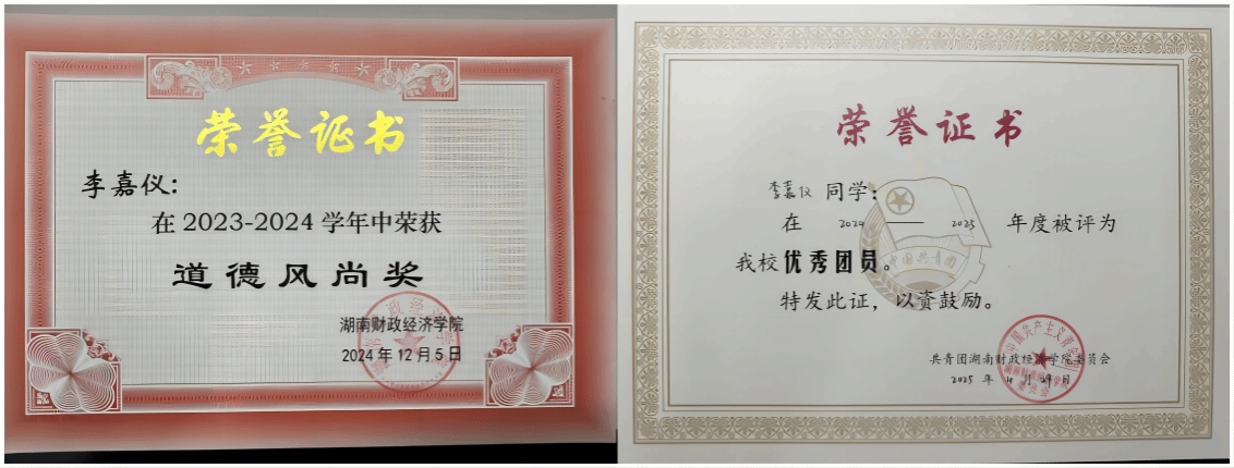 李嘉仪,共青团员,2023级房地产开发与管理专升本,曾担任班级政治委员,曾获2023-2024学年获道德风尚奖、2024-2025学年获优秀共青团员等荣誉。2025年6月考入湘潭市公安局。