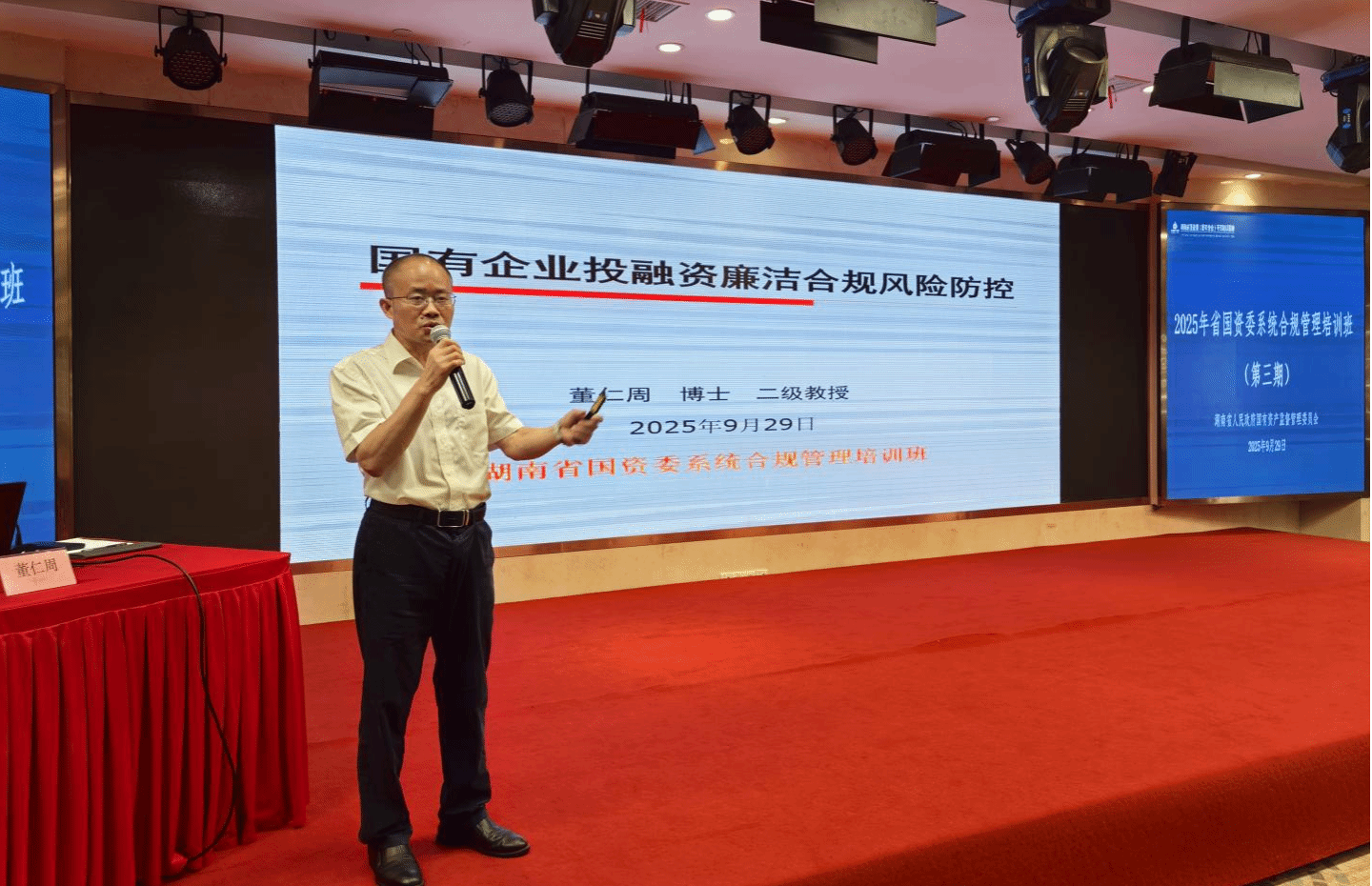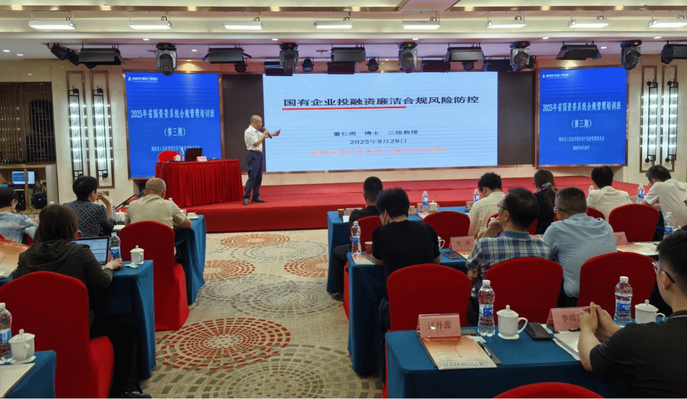 (本网讯)9月29日上午,湖南省法务会计研究基地主任、best365中国官方网站法务会计研究所所长、二级教授董仁周博士应邀为湖南省国资委主办、湖南湘江研究院承办的2025年湖南省国资委系统合规管理培训班(第三期)开展了《国有企业投融资廉洁合规风险防控》专题讲座。湖南省国资委政策研究与法规处等相关处室负责人、干部,省属国有企业负责人与法务、财务、审计等内设机构负责人近150人参加了培训活动。