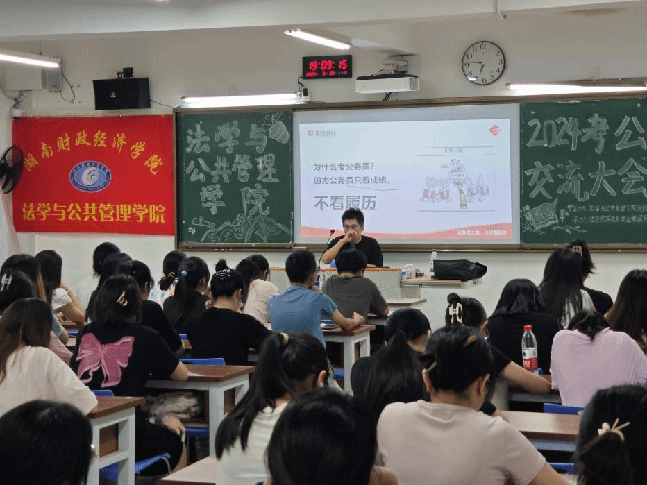 (本网讯)为了帮助同学们了解公务员考试形势及备考策略,9月26日,法学与公共管理学院在主校区3501教室举办了公务员备考交流大会。本次活动特别邀请了资深讲师刘君伟老师作为主讲嘉宾,80余名学生参与。
