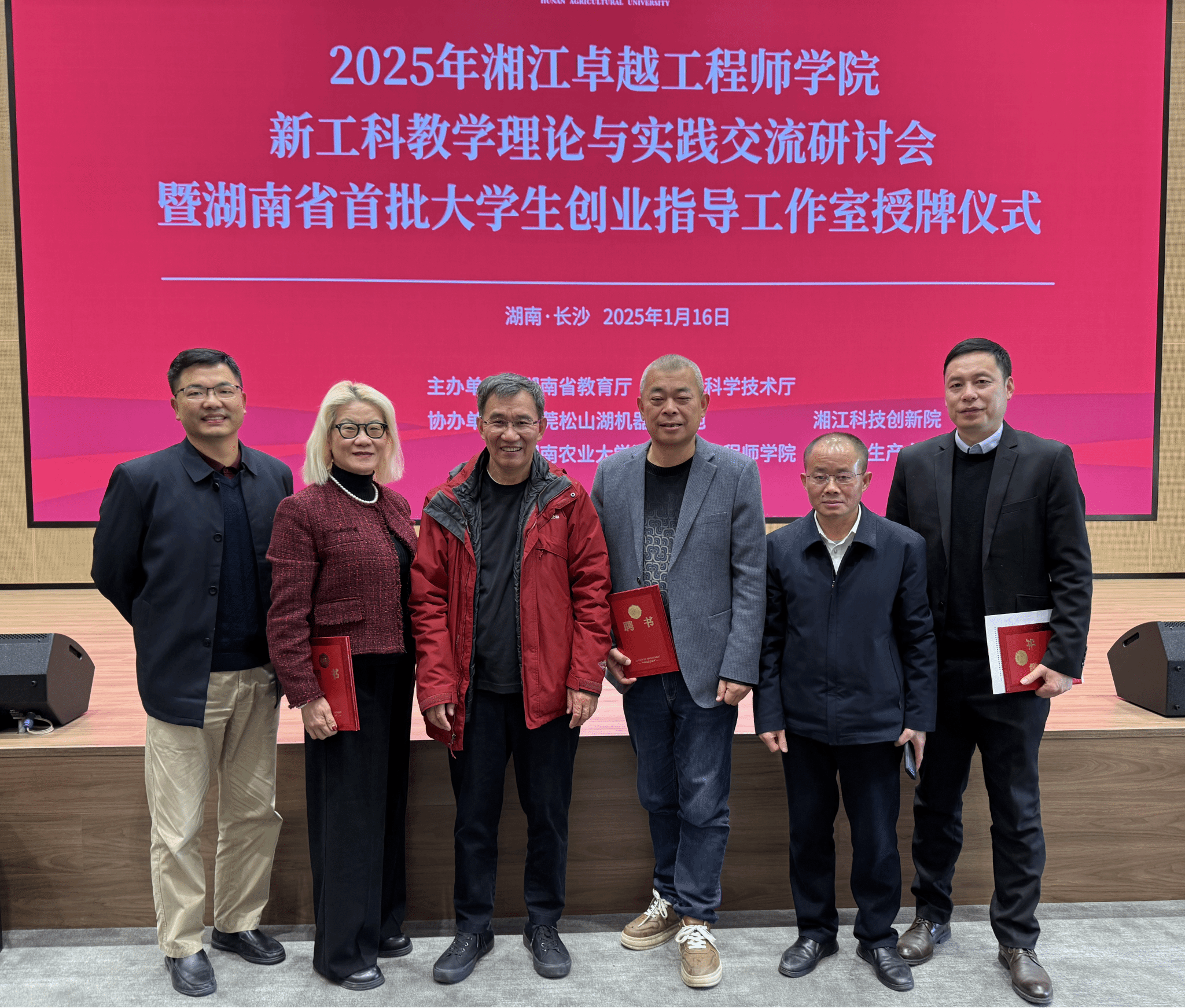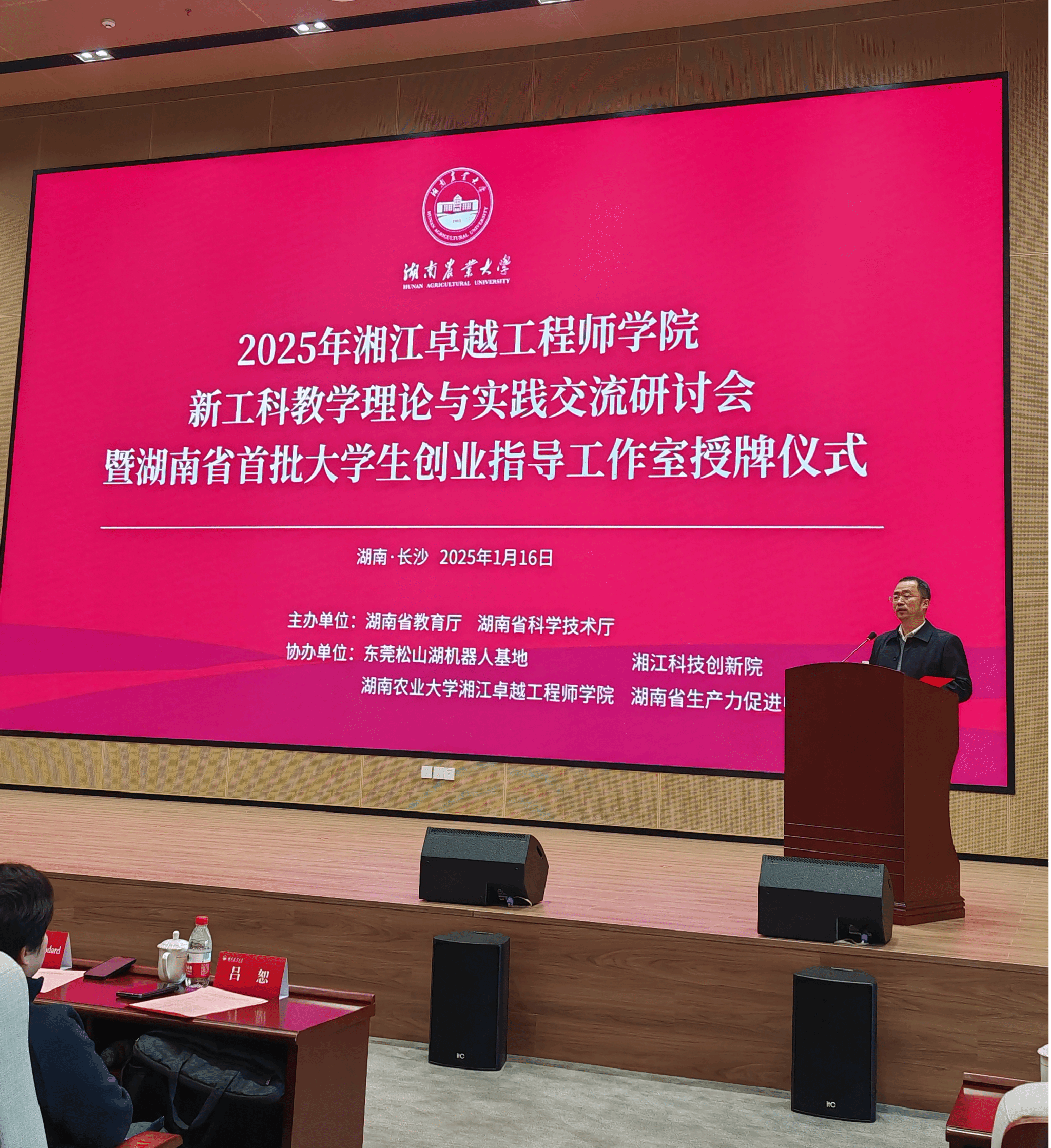 (本网讯)2025年1月16日,湖南省教育厅与湖南省科技厅联合主办的“2025湘江卓越工程师学院新工科教学理论与实践研讨会暨湖南省首批大学生创业指导工作室授牌仪式”在湖南农业大学成功举行,会议由湖南农业大学党委委员、副校长谢方平主持,中国工程院院士、湖南农业大学校长邹学校,湖南省教育厅副厅长兰勇,湖南省科技厅副厅长周斌,湖南省人力资源和社会保障厅二级巡视员雷峻,以及共青团湖南省委副书记叶妙出席会议,湖南省大学生创业导师代表、省内外高校院所代表200余人参加会议。