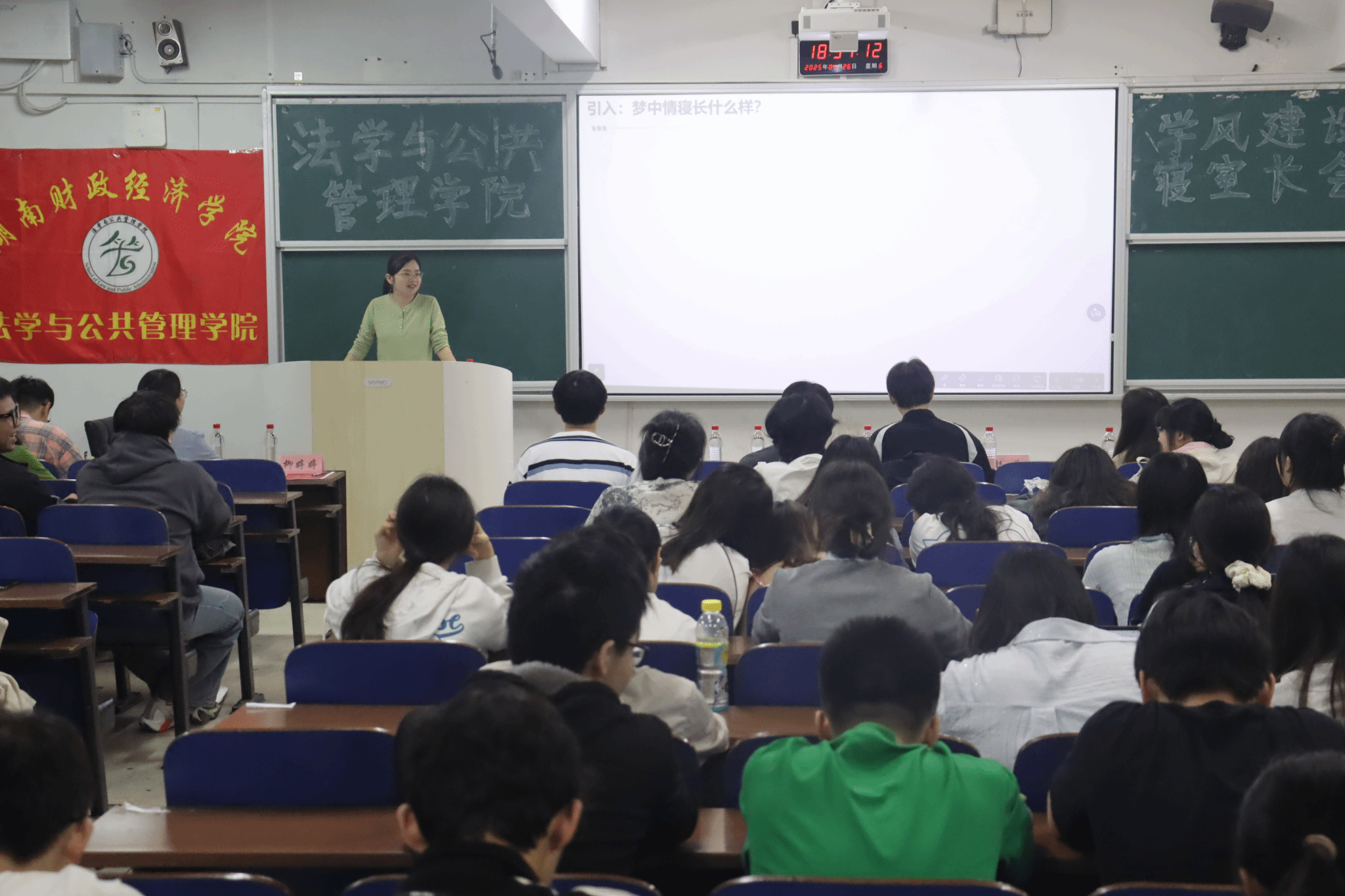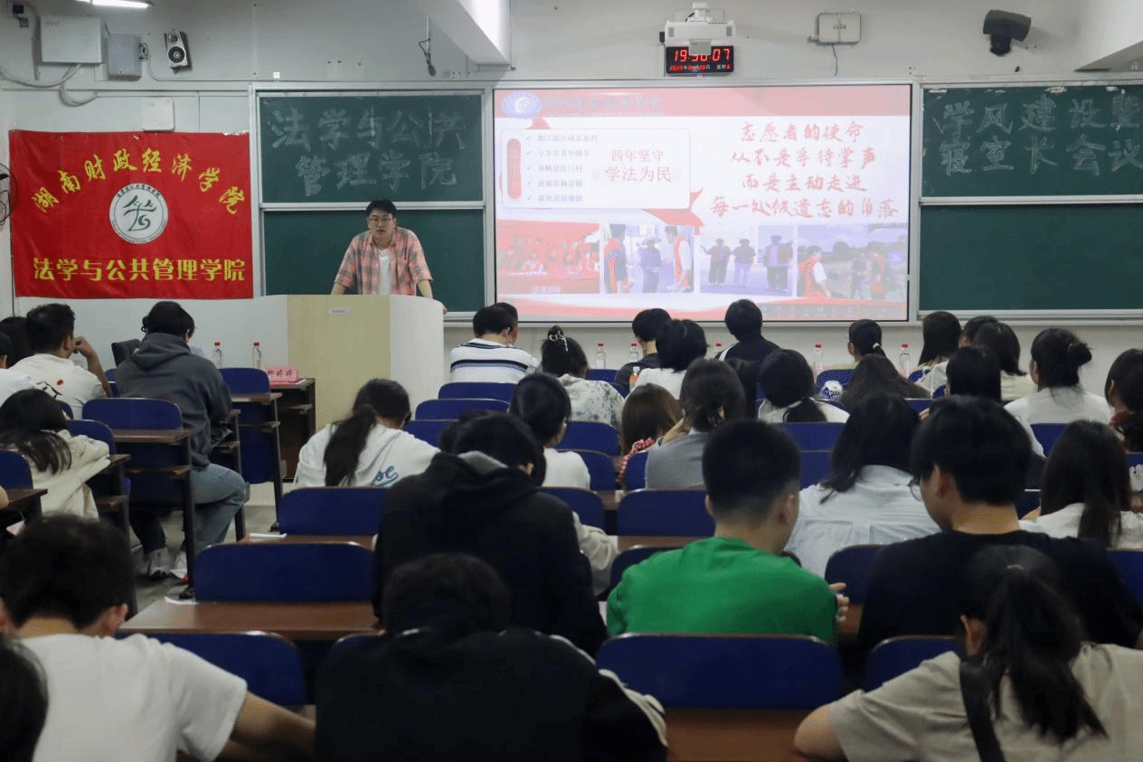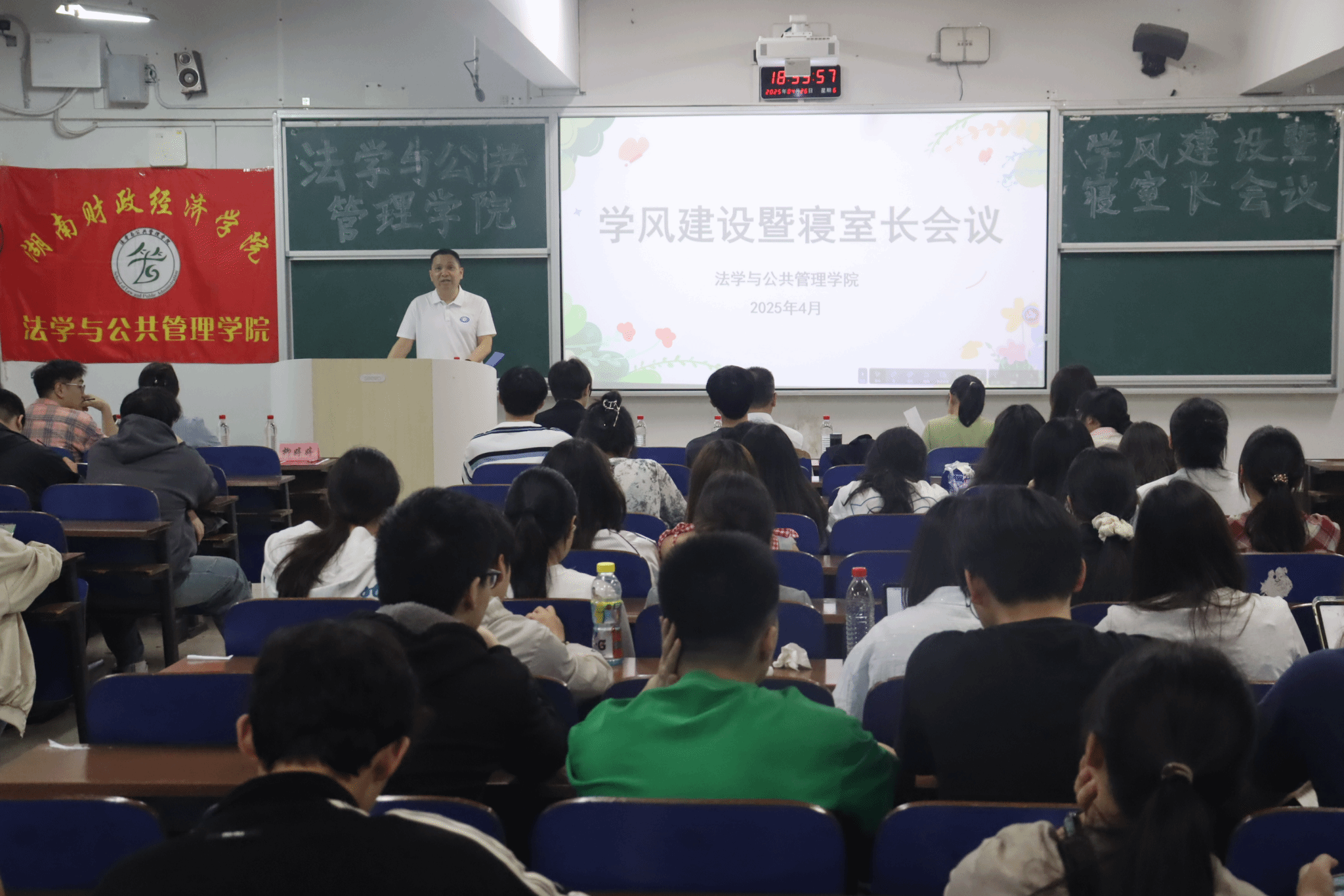 (本网讯)为深入推进学院学风建设,强化学生宿舍管理,营造良好的学习和生活环境,4月26日,法学与公共管理学院于主校区3111教室召开了学风建设暨寝室长会议,学院党委书记何四海、党委副书记李茂华、学工办主任彭兰,以及辅导员胥丛笑、刘践凡出席会议,近100名寝室长到场参会,本次会议由李茂华主持,特别邀请了优秀毕业生李文艳、周超,优秀寝室长张诗雨、杨菁分享经验。
