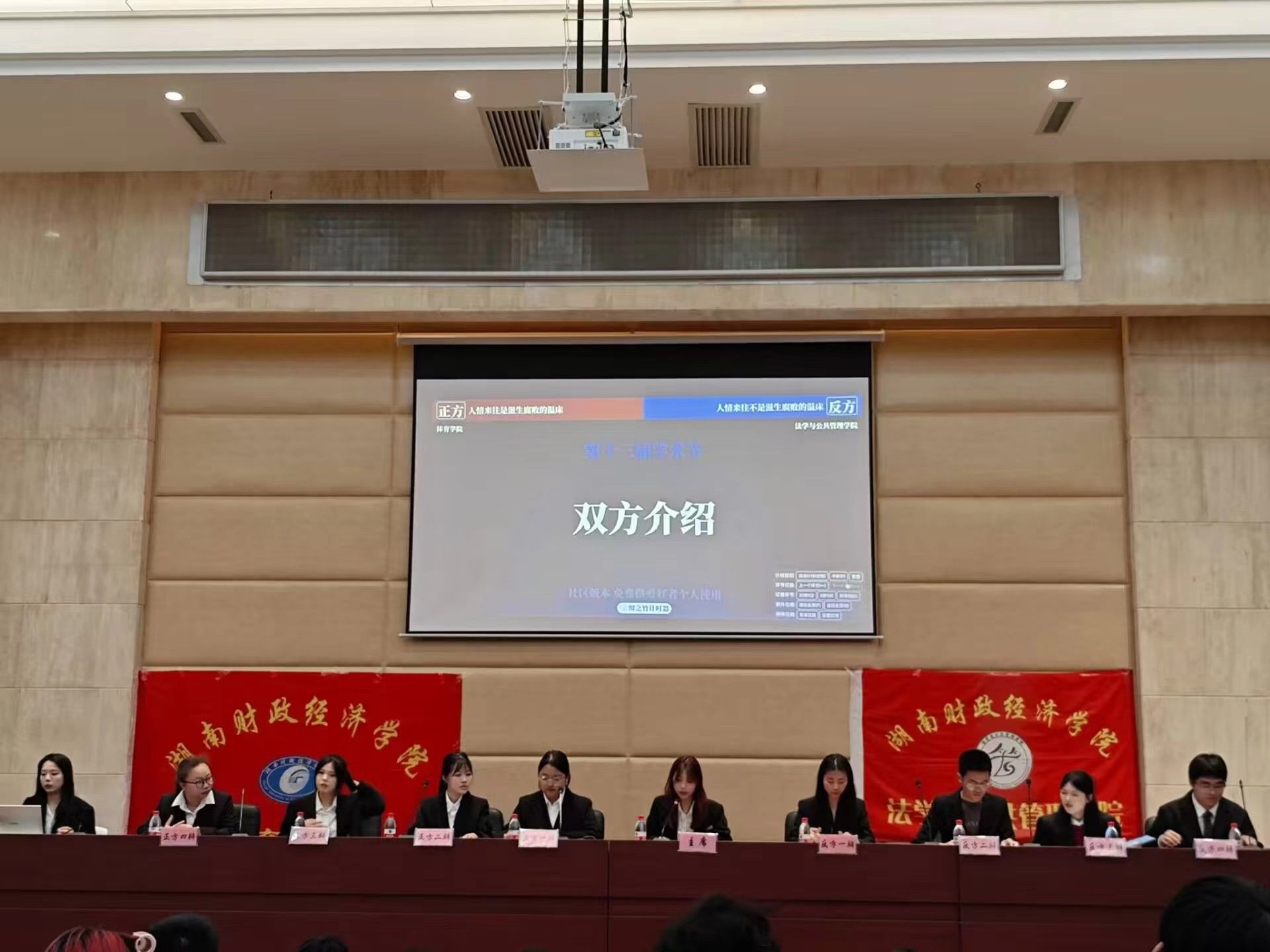 (本网讯)5月25日,第十三届学术节辩论赛决赛在图书馆学术报告厅417隆重举行。经过激烈的角逐,法学与公共管理学院代表队凭借出色的表现和扎实的辩论功底,成功摘得本届辩论赛的冠军。
