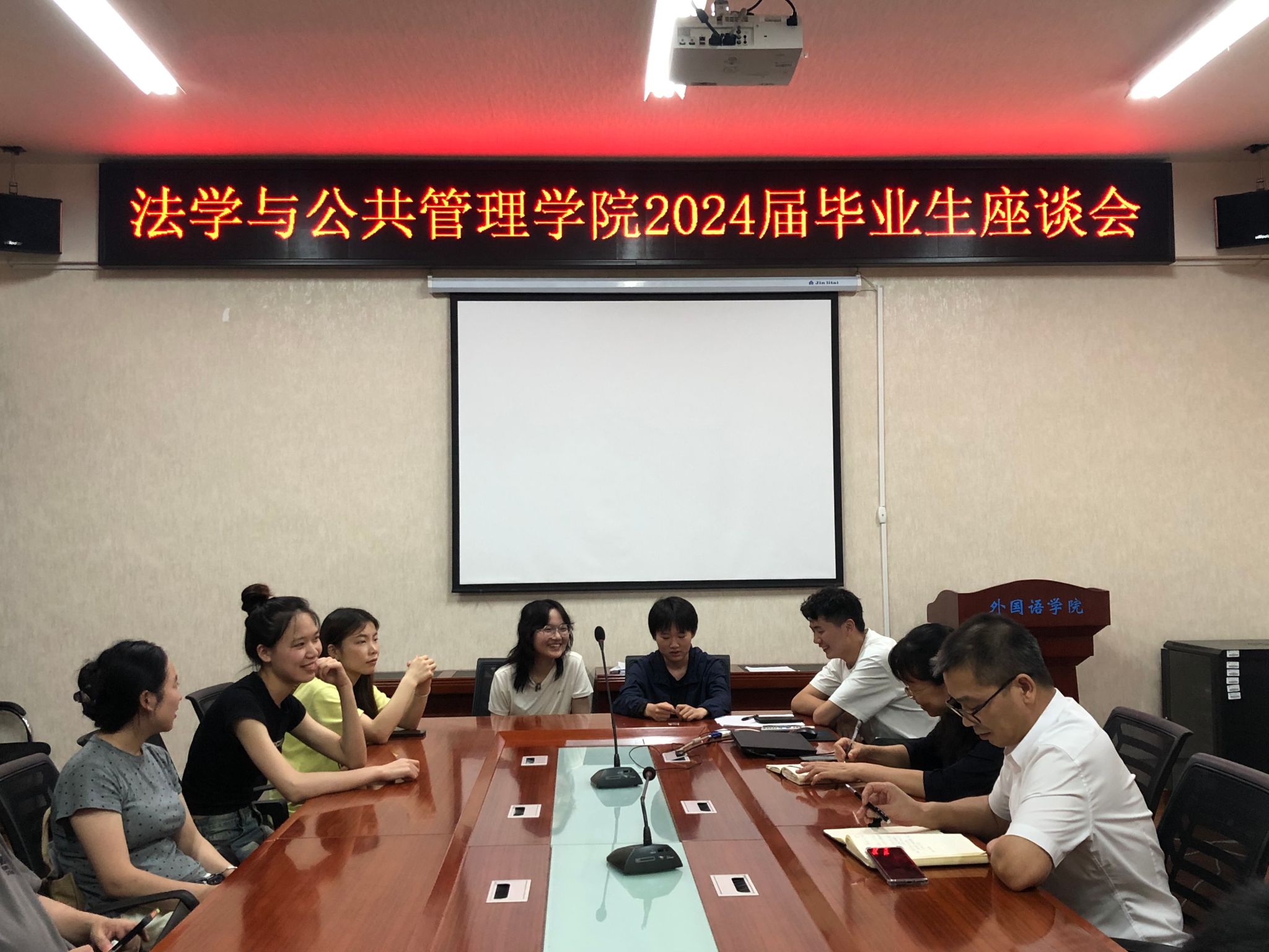 (本网讯)夏日的阵雨带走了空气中的闷热,毕业季的火热仍在持续,学位授予仪式的帷幕刚刚拉上,奔赴山海的行囊又已备好。6月20日晚7:30,在2024届毕业生即将离开母校扬帆远航之际,法学与公共管理学院在315会议室召开了毕业生座谈会,学院7个毕业班共12位代表参加,学院党政负责人何四海出席了会议。会议由学院副院长彭赛红主持。