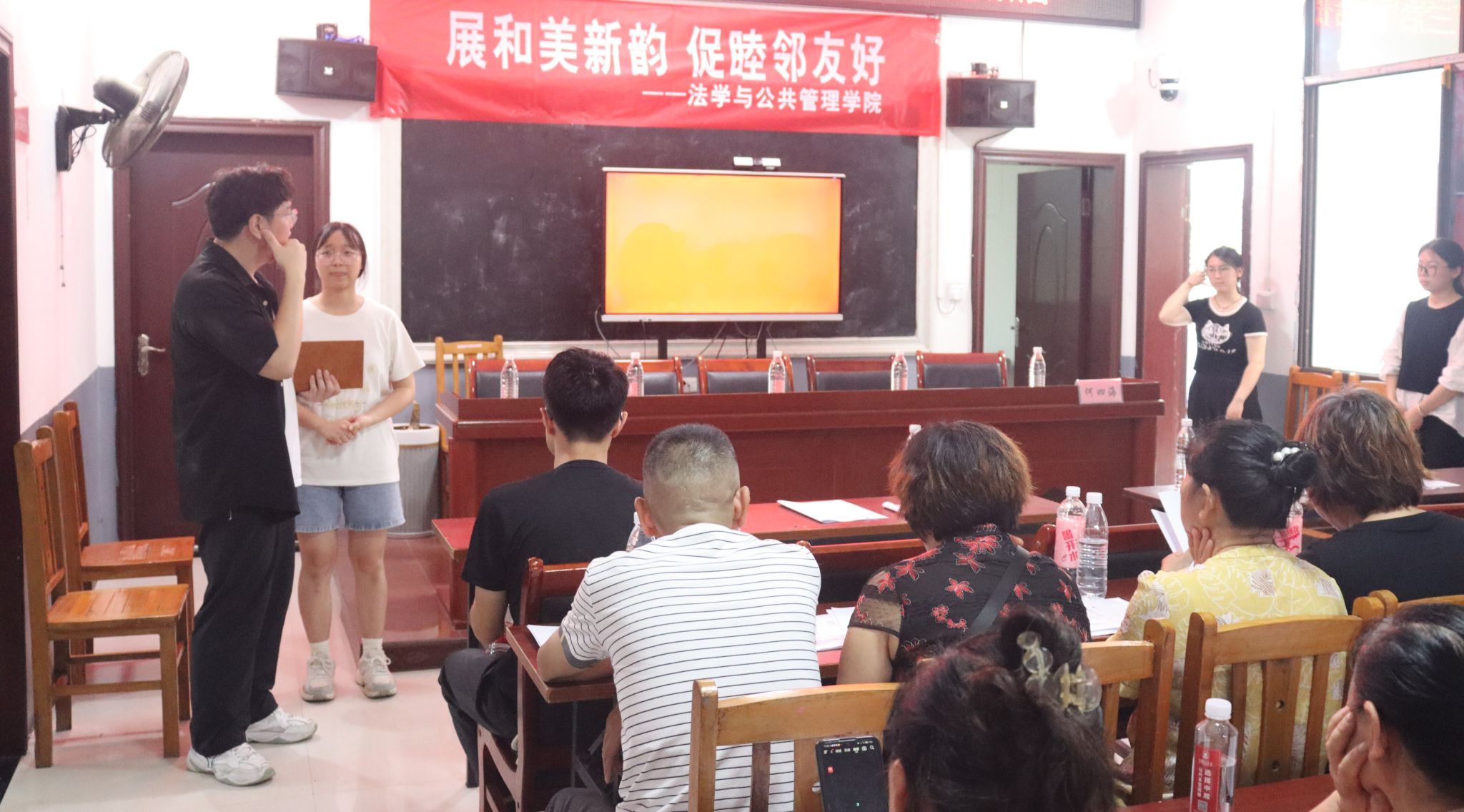 活动伊始,师生代表们在村部大会议室组织与江口村干部进行了座谈交流,详细了解了村庄的发展现状和未来规划。法学与公共管理学院党政负责人何四海主持此次会议,他指出调解是乡村解纷的一项重要手段,对维护乡村和谐稳定具有不可替代的作用。学院将与各位村民一道,共同推进江口村的乡村治理,让法治精神深入人心,让睦邻友好的氛围在江口村传得更广。