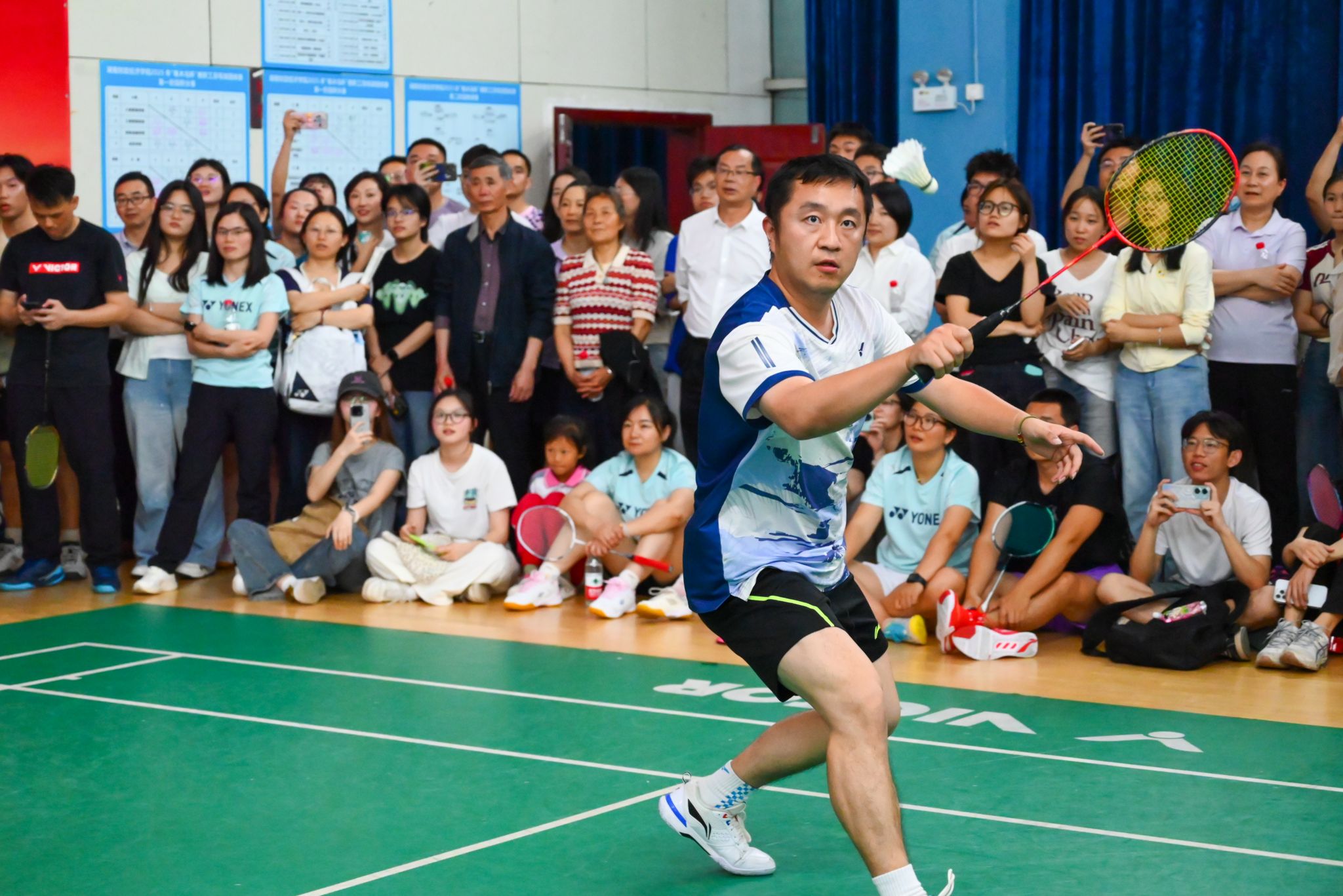 在总决赛的激情余韵中,校工会精心打造的“冠军表演赛”压轴登场。体育学院教师、羽毛球世界冠军张稳、骆羽、熊俊、骆赢联袂献上了一场精彩绝伦的羽坛盛宴。冠军们配合默契,眼神如炬,步伐灵动。他们时而侧身蓄力,时而手腕轻抖,每一次战术的巧妙变换,每一回合技术的巅峰博弈,都让现场观众大饱眼福,喝彩声、欢呼声回荡全场。