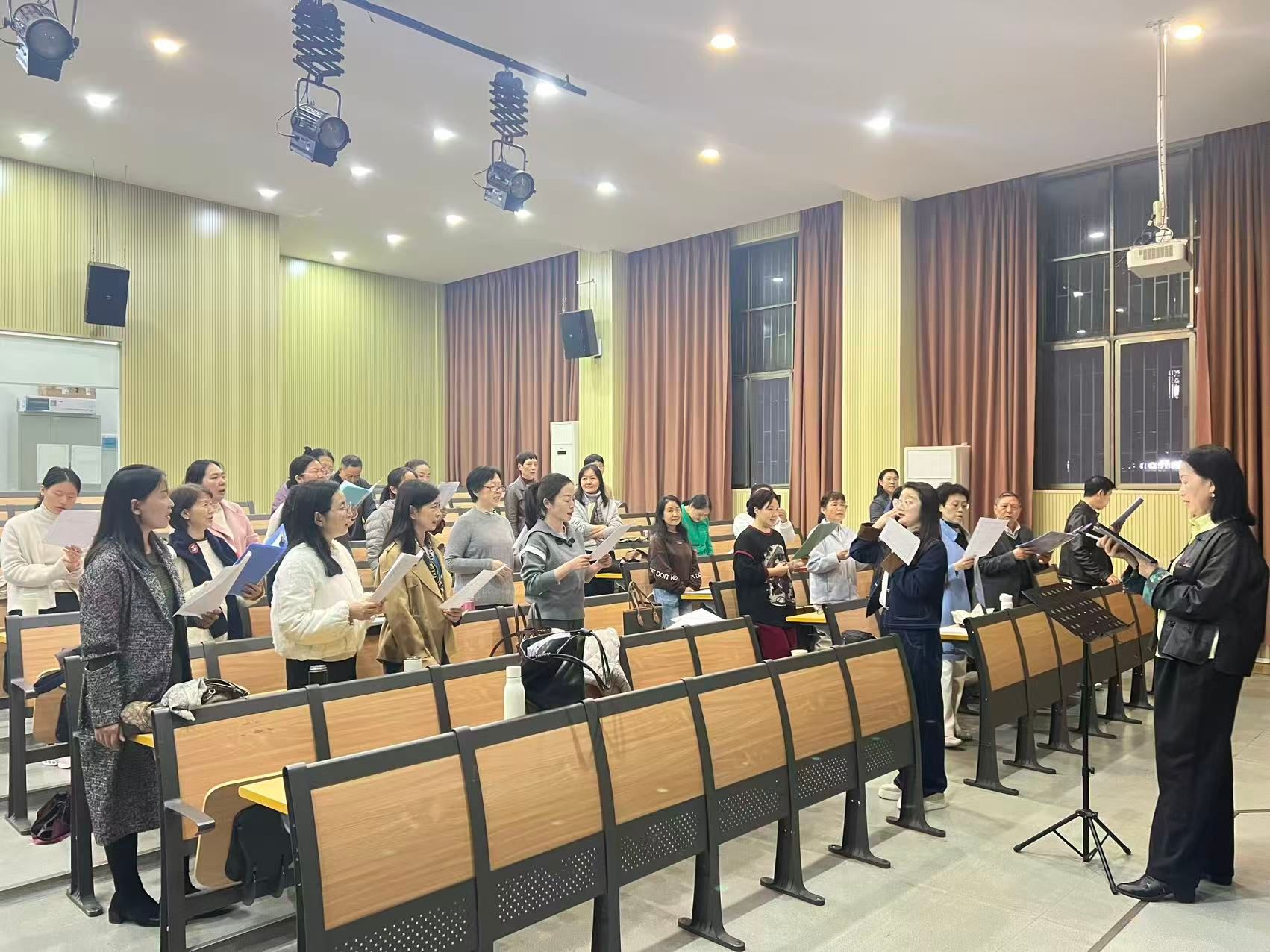 校教职工合唱协会指导老师张亚男亲身示范唱法,直观展现声音技巧与表情管理,以声音精准传递情感张力。会员们聚精会神,反复打磨,展现出了高度的合作精神与认真态度,每一个音符都透着专注,每一次和声都凝聚着力量。