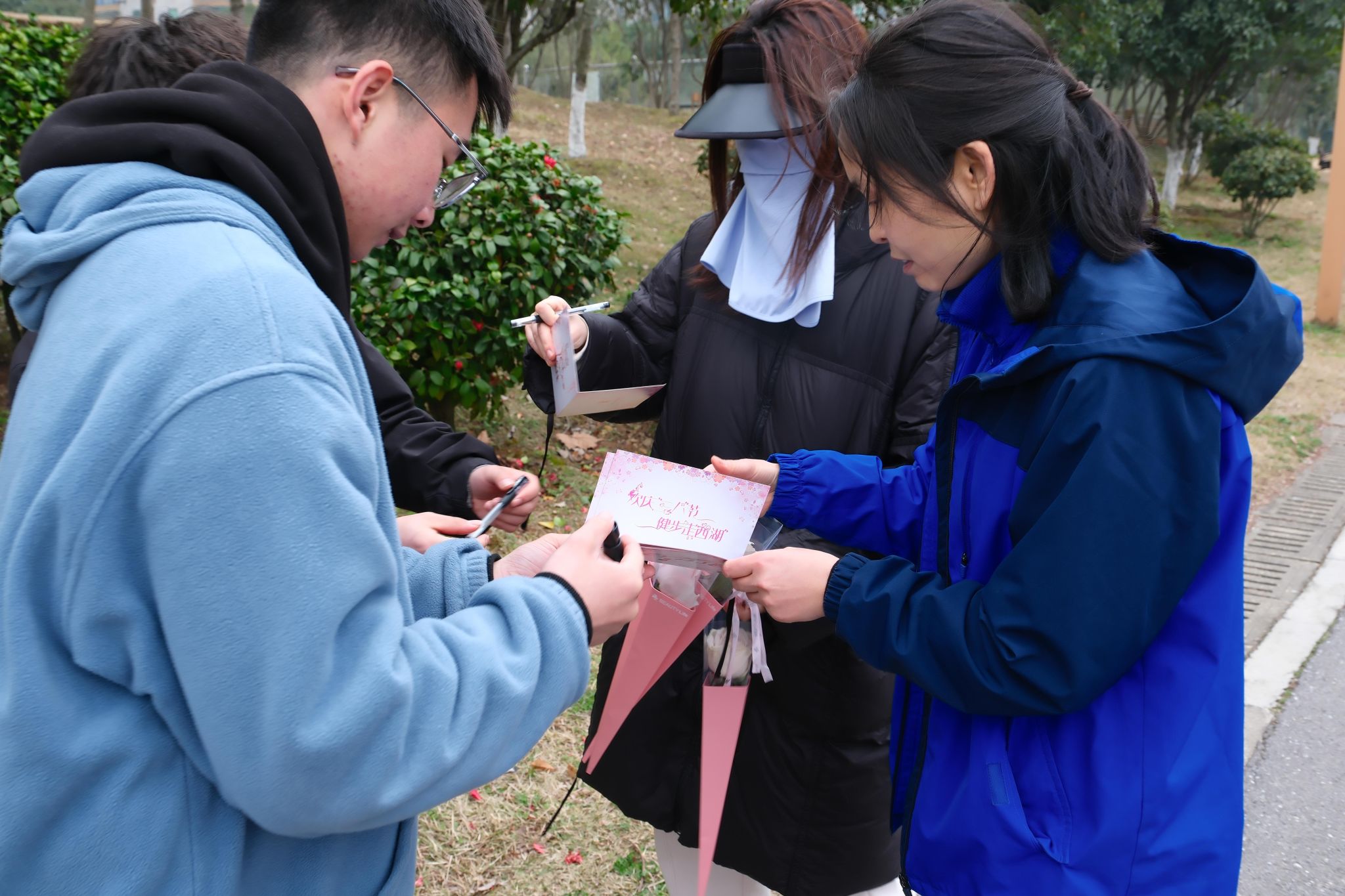 完成环西湖公园健步走一圈后,女教职工们凭借已盖章的贺卡到集合点进行惊喜抽奖并兑换奖品全体女教职工都收获了一份节日的惊喜。