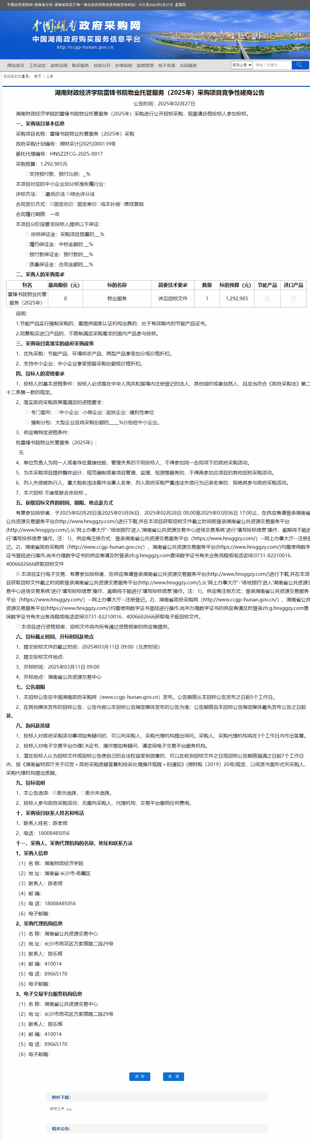 湖南省政府采购网:best365中国官方网站雷锋书院物业托管服务(2025年)采购项目竞争性磋商公告