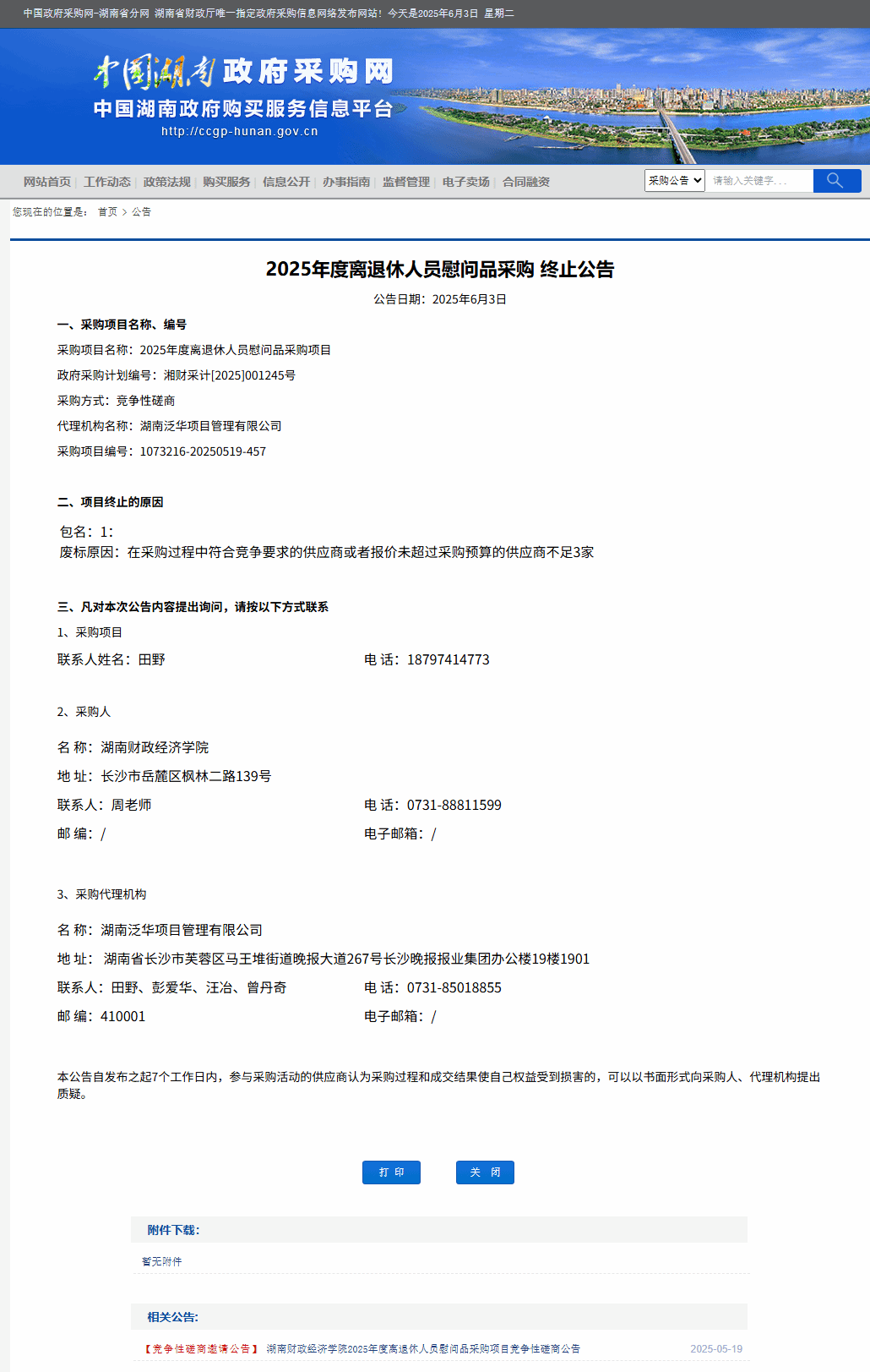 湖南省政府采购网:best365中国官方网站2025年度离退休人员慰问品采购终止公告