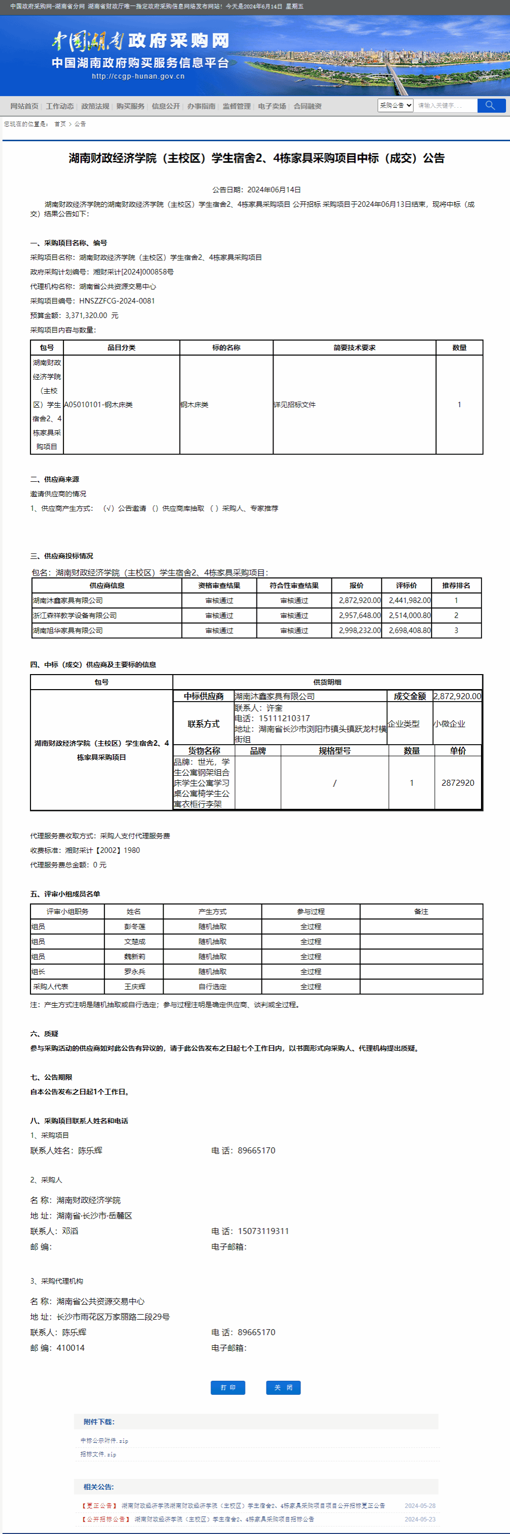 湖南省政府采购网:best365中国官方网站(主校区)学生宿舍2、4栋家具采购项目中标(成交)公告