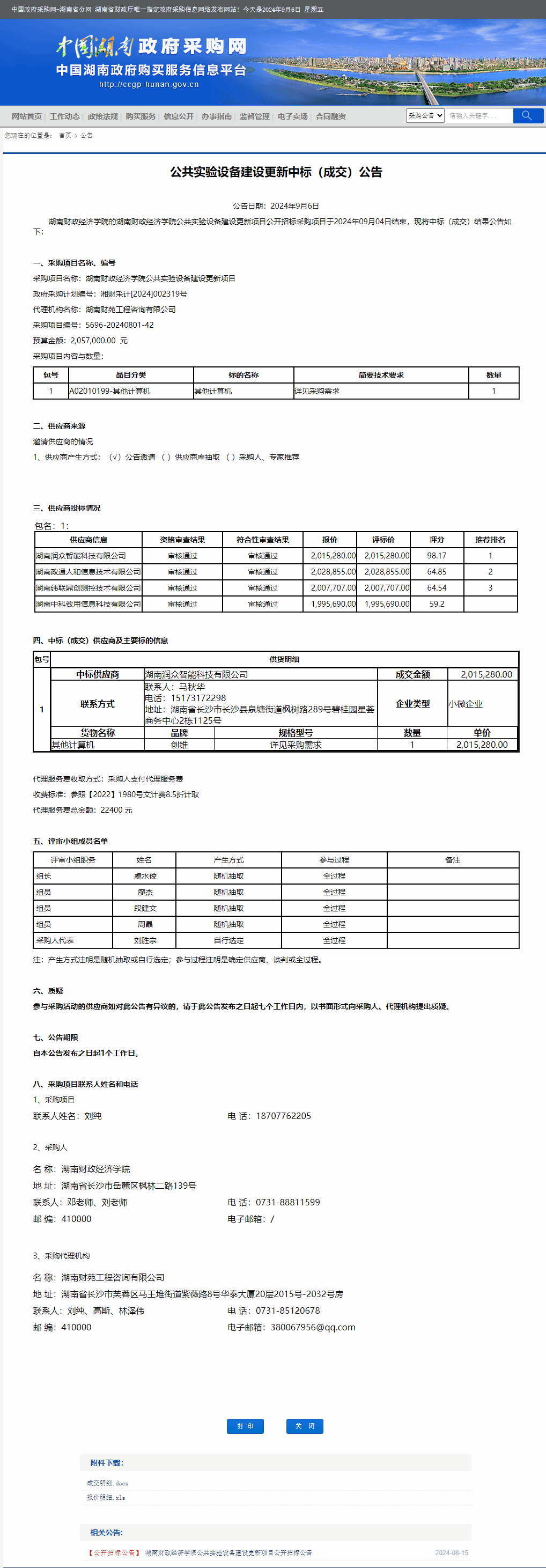 湖南省政府采购网:公共实验设备建设更新中标(成交)公告