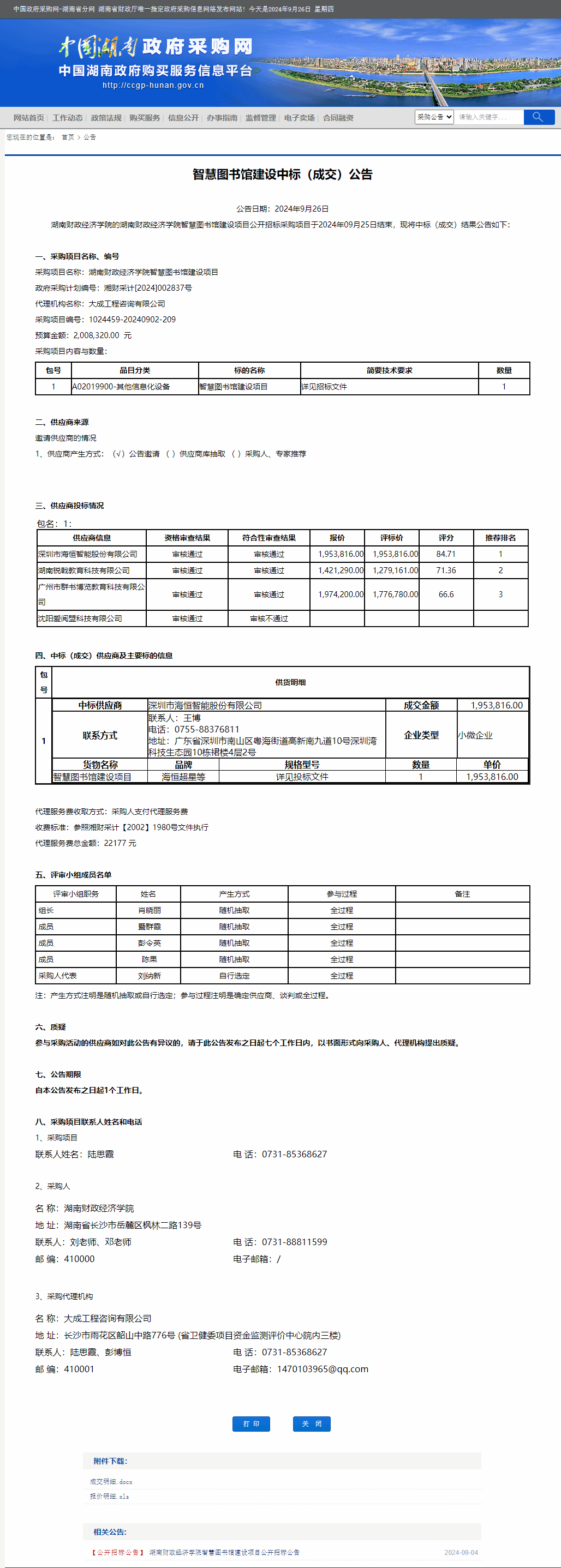 湖南省政府采购网:best365中国官方网站智慧图书馆建设中标(成交)公告