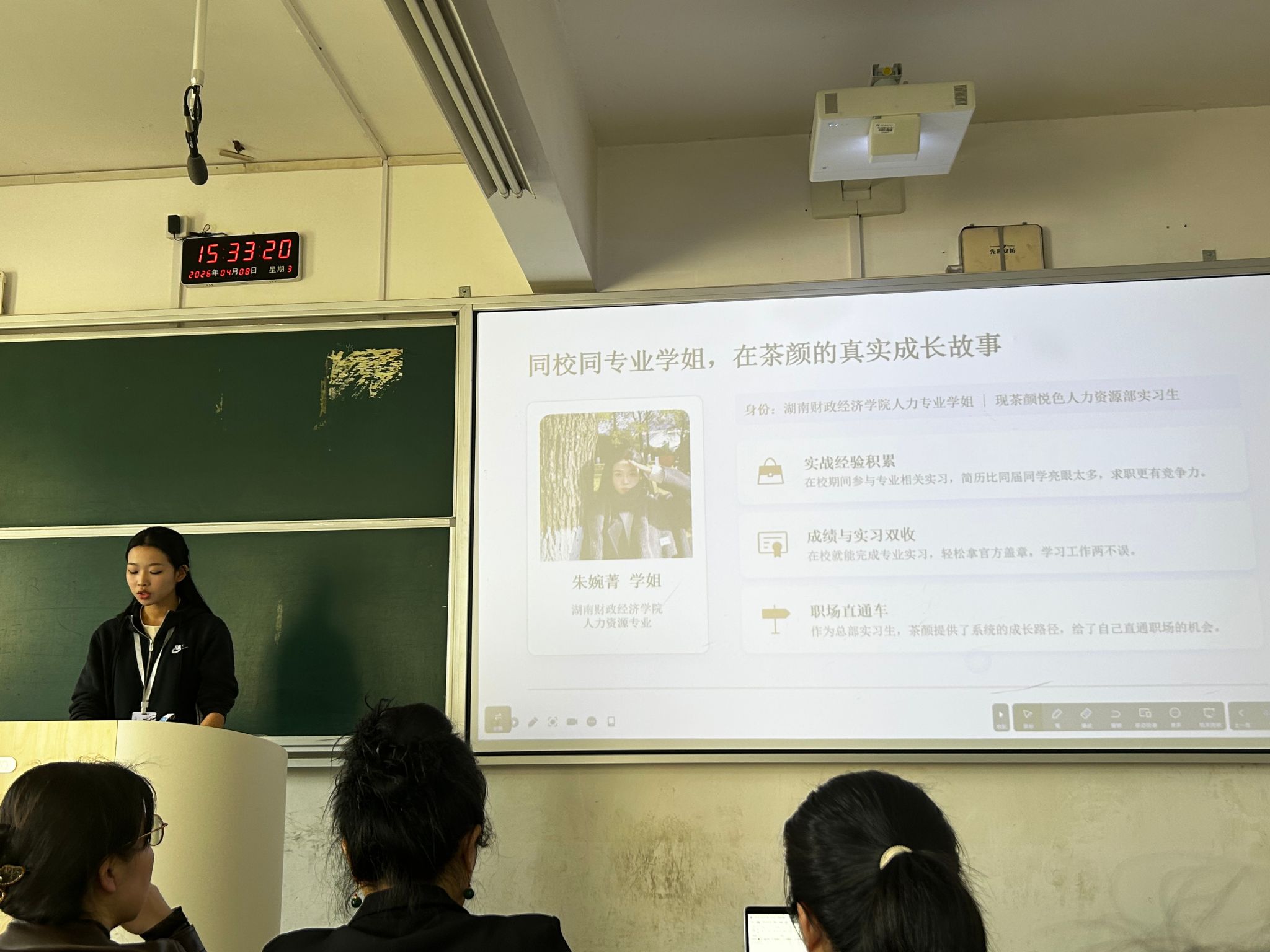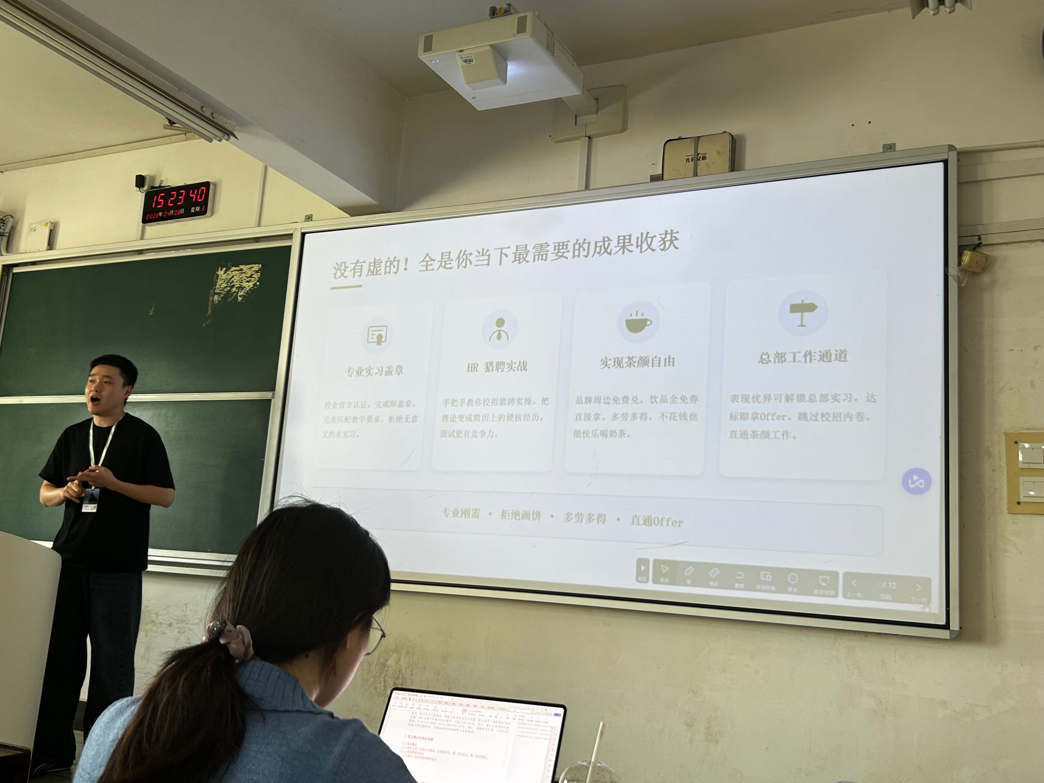 茶颜悦色人力资源管理部项目负责人李博浩围绕项目整体规划作详细介绍。他指出,本项目主要面向人力资源管理专业大二学生,企业将提供专属招聘通道、标准化宣传物料、全流程数据跟踪服务及阶梯式激励机制,确保项目落地有序、运行高效。尤为值得一提的是,项目期间表现优异的同学,将有机会直接获得茶颜悦色总部的实习资格乃至转正录用通知,真正实现“学有平台、练有舞台、优有舞台”。
