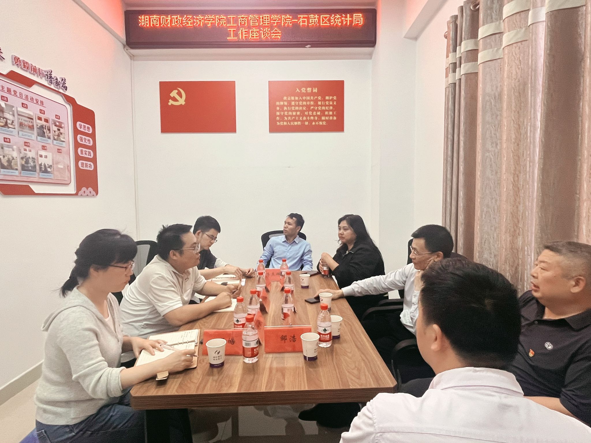 4月10日下午,调研组首站前往衡阳市石鼓区统计局开展党务工作交流。石鼓区统计局局长陈富民带领单位党务骨干参与座谈,双方围绕基层党组织标准化建设、党建与业务融合创新、党员教育管理模式等议题展开深入探讨。王跃军表示,石鼓区统计局在党建引领统计服务、数据赋能基层治理等方面的经验值得借鉴,希望未来通过共建平台深化合作,实现资源共享、优势互补。陈富民对学院一行表示欢迎,并期待以党务工作为纽带,推动校地合作再上新台阶。