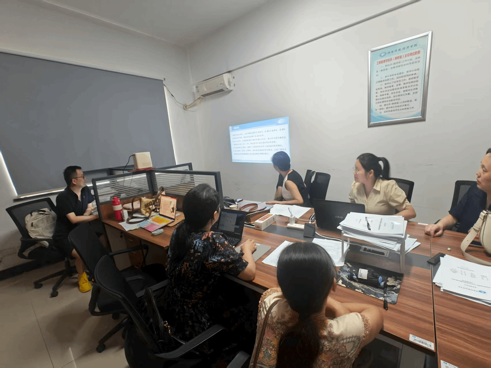 7月14日全系教师齐聚405办公室开展集中磨课,进一步聚焦“OBE理念与课程设计融合”实践。各课程负责教师依次上台,围绕“核心教学环节设计”进行20分钟说课展示,工商系资深教师组成点评组,即时交流指导。新老教师优势在磨课中充分彰显:资深教师凭借教学设计经验,指导教学环节如何更贴合学生认知规律;年轻教师以创新思维推动理念落地,形成“经验传承+创新突破”的良好互动氛围。如欧阳乐茜老师在《管理研究方法》“决策分析”环节,创新性引入决策树的机器学习算法,将传统决策分析与前沿技术结合,让学生在掌握基础方法的同时接触管理学最新成果,既贴合OBE“能力培养”目标,又紧跟学科前沿,为课程注入了新的活力。