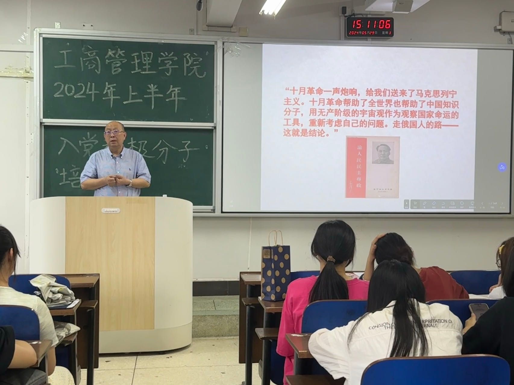 (本网讯)5月29日,我院在3110教室举行2024年上半年入党积极分子培训班开班仪式暨党课培训活动。党委委员、副校长赵鹤平,学院党委书记郭丽、院长杨鹏、学院团总支书记李祎成及培训班全体学员参加活动。学生第二党支部书记温嘉伟主持开班仪式。