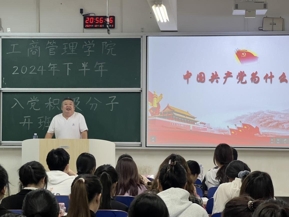 (本网讯)10月16日晚,工商管理学院2024年下半年入党积极分子培训班开班仪式暨党课培训活动在3503教室举行。工商管理学院党委书记王跃军出席开班仪式,并为入党积极分子讲授第一堂党课。院党委委员唐力翔、学生第三支部书记邓华强及全体入党积极分子参加开班仪式。开班仪式由学生第三支部宣传委员邱海琪主持。
