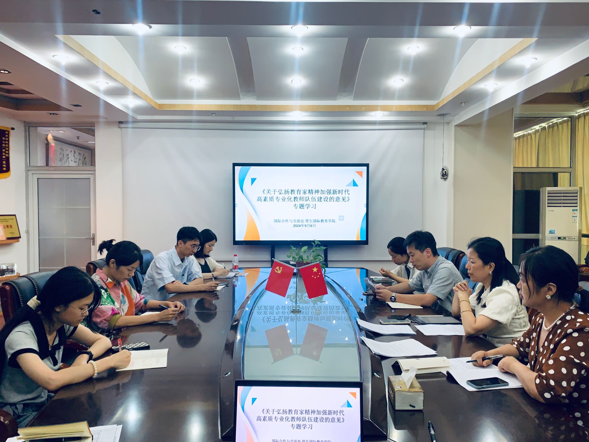 会议首先贯彻落实了第一议题学习,由院直属党支部书记肖平飞带领大家认真学习了《关于弘扬教育家精神加强新时代高素质专业化教师队伍建设的意见》,并详细解读了《best365中国官方网站教师师德失范行为负面清单及处理办法》和《best365中国官方网站教师师德失范行为通报警示暂行办法》;国合处处长傅佳领学了《湖南省教育行政处罚自由裁量基准》,重点学习了与中外合作办学业务相关的非法牟利行为和裁量基准,筑牢大家的思想防线。