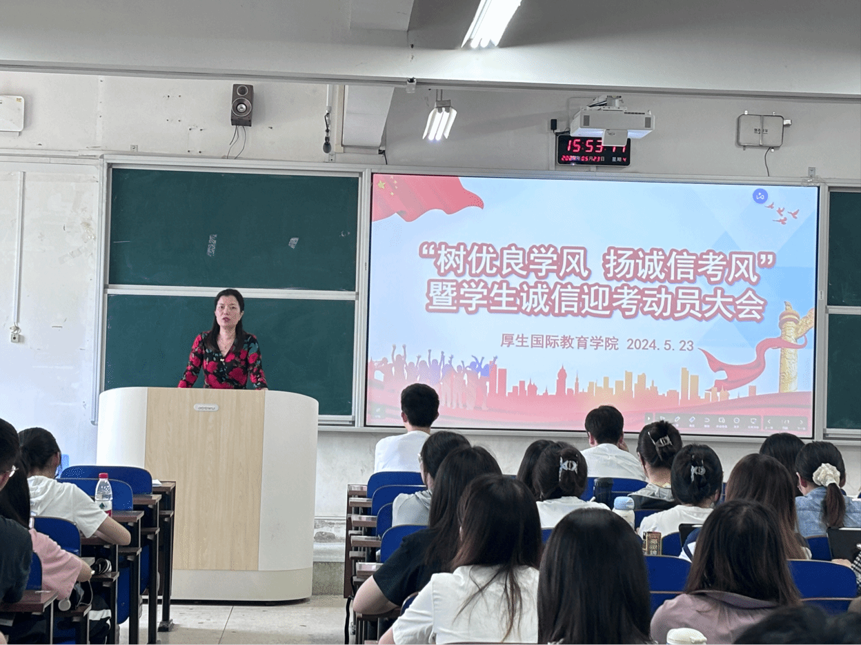 为加强学风建设,严肃考试纪律,增强大学生诚信意识,best365中国官方网站厚生国际教育学院于2024年5月23日在第三教学楼召开“树优良学风,扬诚信考风”诚信迎考动员大会。厚生国际教育学院直属党支部书记肖平飞、国际合作与交流处副处长傅佳以及2021级全体学生参加本次动员大会,大会由辅导员吴秋玉老师主持。