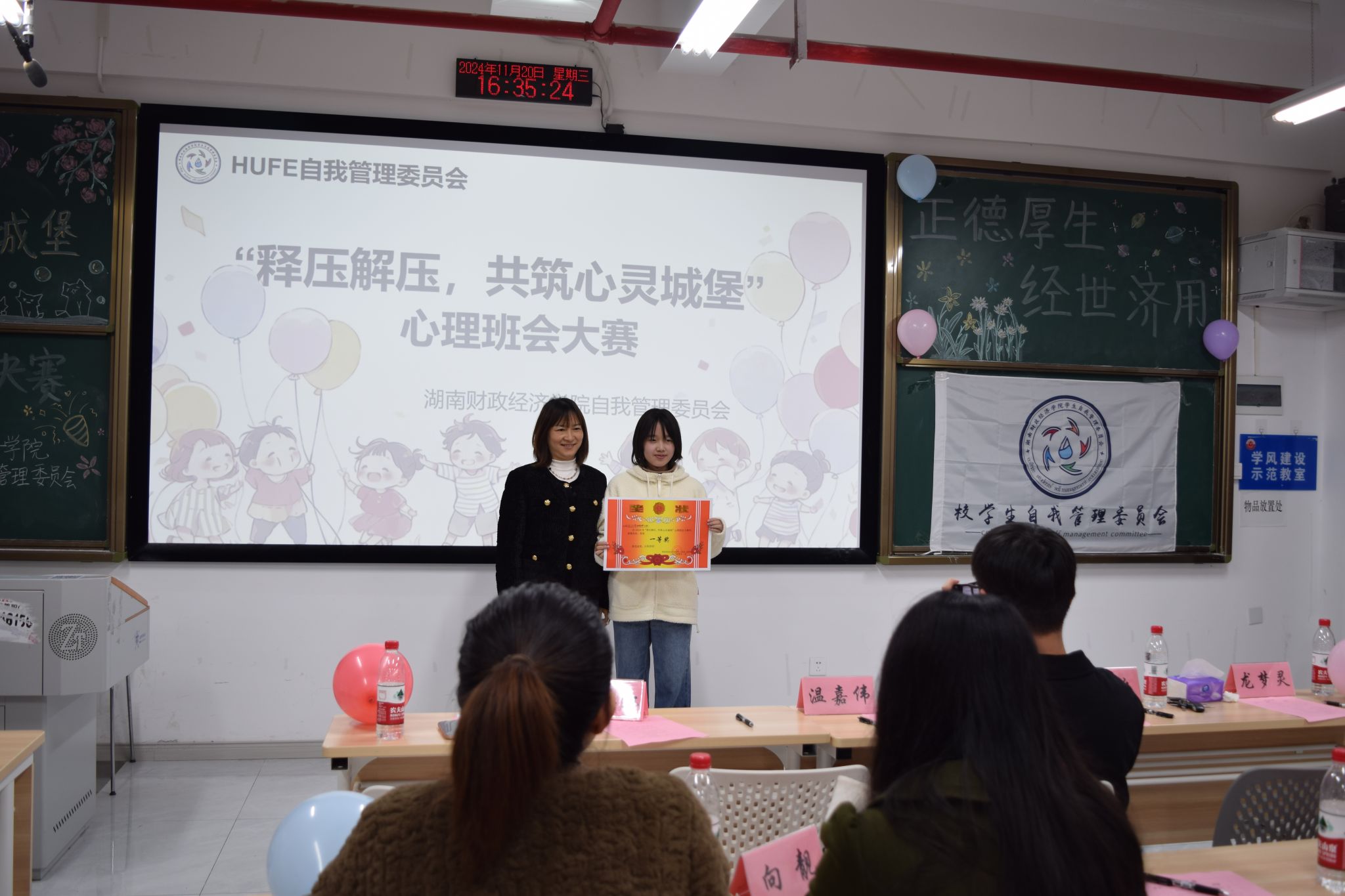 11月20日,2024级会计学(中外合作办学)三班代表学院参加“释压解压,共筑心灵城堡”心理班会校级决赛,荣获校级一等奖。该班级的心理班会从认识压力、测试压力、打破压力三个方面进行讲解,不仅分享专业的心理知识,还以独具匠心的策划、深入浅出的讲解,让班级同学对压力有了更深刻的认识。