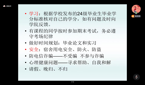 2023年12月12日晚,厚生国际教育学院2024届毕业生通过腾讯会议举行了线上期末主题班会。此次班会旨在对学生进行学习、安全、实习、就业、考研等全方位指导,由毕业班辅导员陈伶俐主持,全体毕业生参加。