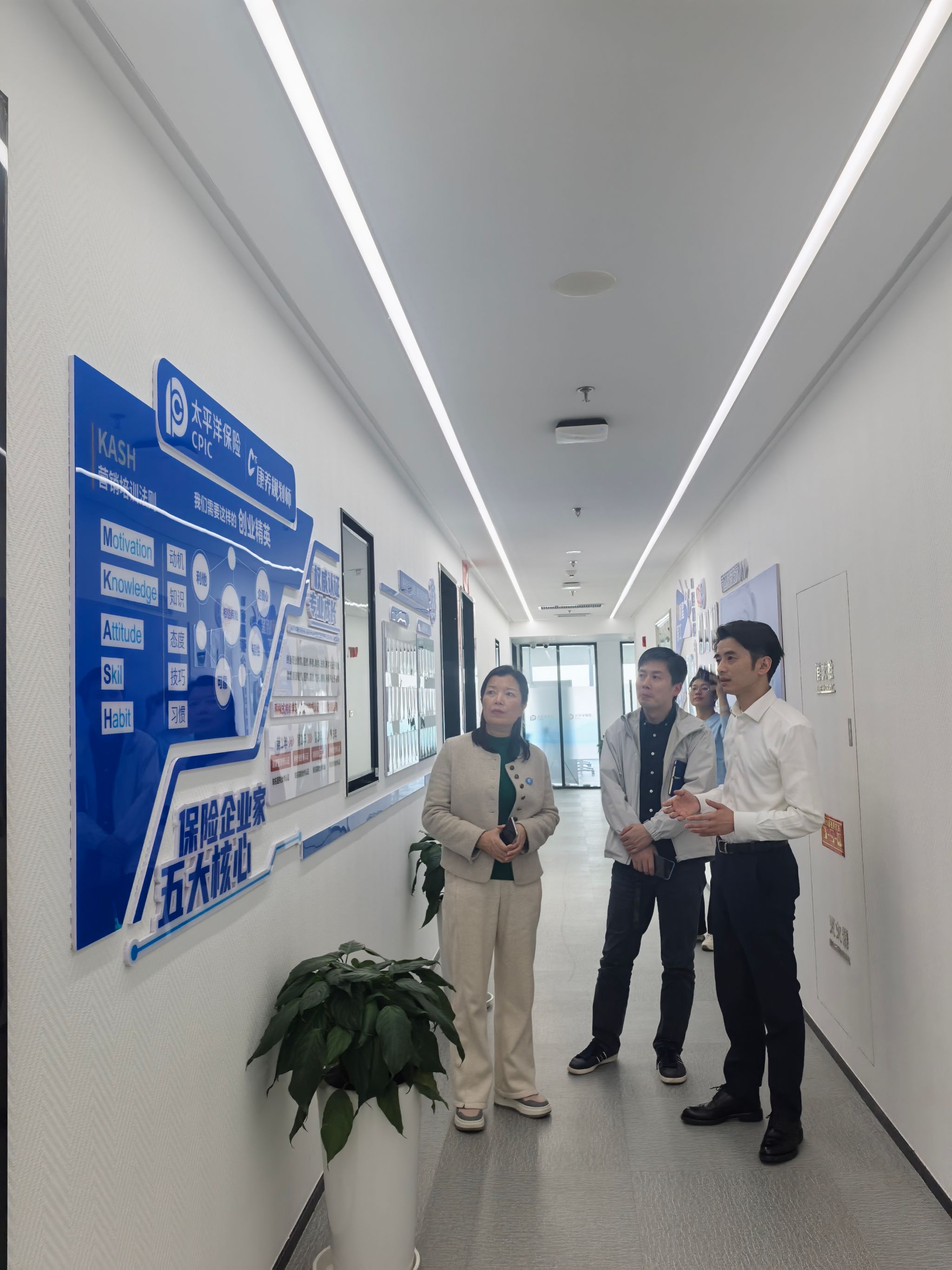 在长沙中心支公司副总经理黎书达的陪同下,肖平飞一行参观了太平洋保险体验中心,近距离了解了太平洋保险的发展历程、企业文化,亲身感受了智能化服务与业务建设的成果。