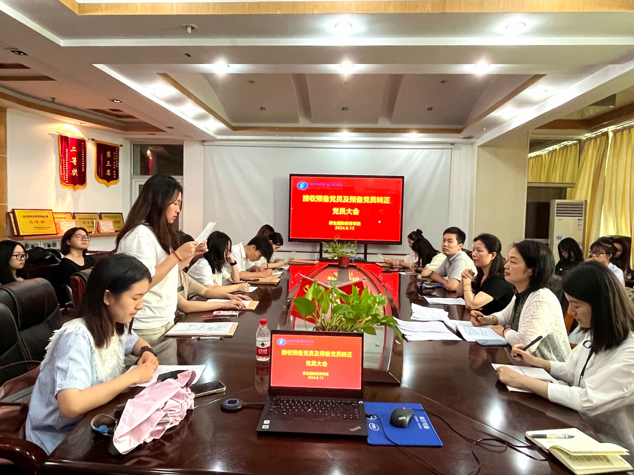 6月13日下午,厚生国际教育学院直属党支部在办公楼830会议室召开预备党员接收暨预备党员转正党员大会。会议由支部书记肖平飞主持,对姜昕悦等10名发展对象接收为预备党员、对江雯慧等6名预备党员发展为中共正式党员进行讨论和表决。此次会议应到33人,实到32人,其中包括有表决权党员12人,发展对象10人。