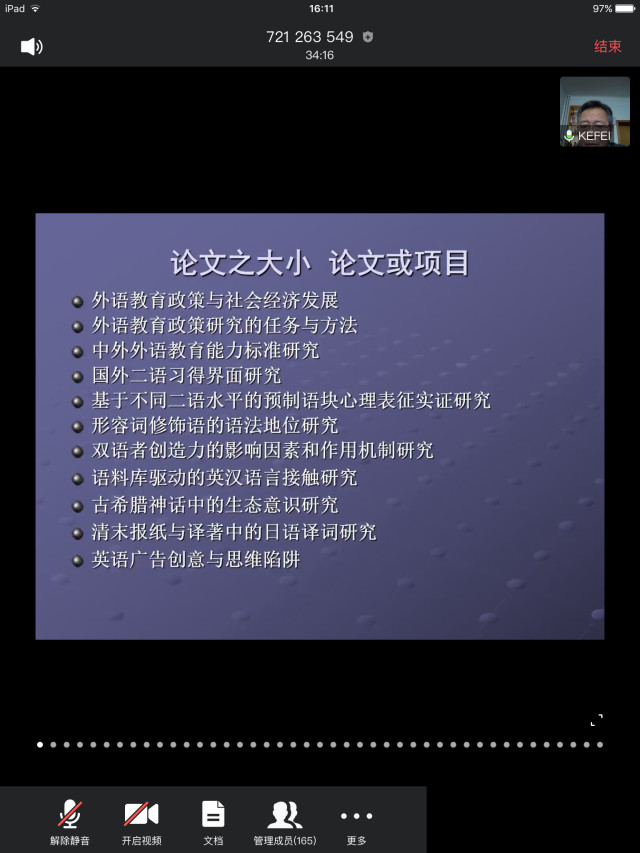 湖南日报·新湖南客户端5月1日讯(通讯员 杨慧)4月29日下午,北京外国语大学博士生导师、《外语教学与研究》主编王克非教授应邀为湖南财院外国语学院师生开展题为“论文撰写中的若干问题”的线上学术讲座。外国...