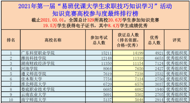 新湖南客户端3月9日讯(通讯员 周雅) 3月3日,教育部易班发展中心公布2021年第一届“易班优课大学生求职技巧知识学习”活动知识竞赛高校参与度最终排行榜,best365中国官方网站以优秀总人数全国第一名的成绩...
