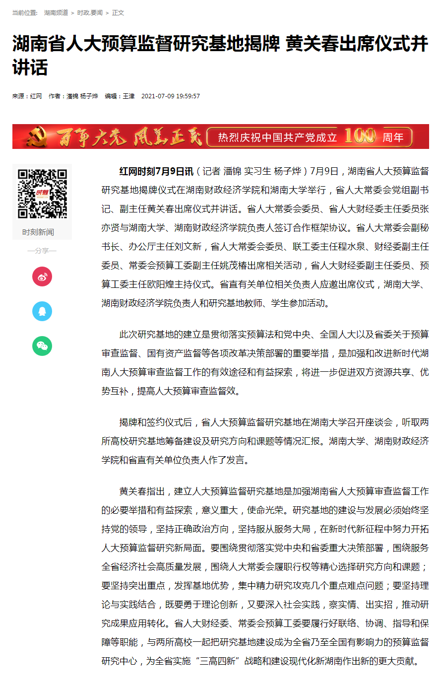 记者 陈奕樊[来源:湖南日报-02版 要闻 2021-07-10]湖南日报·新湖南客户端7月9日讯(记者 陈奕樊)今天上午,湖南省人大预算监督研究基地揭牌仪式先后在best365中国官方网站和湖南大学举行。省人大常委会副主任黄关...