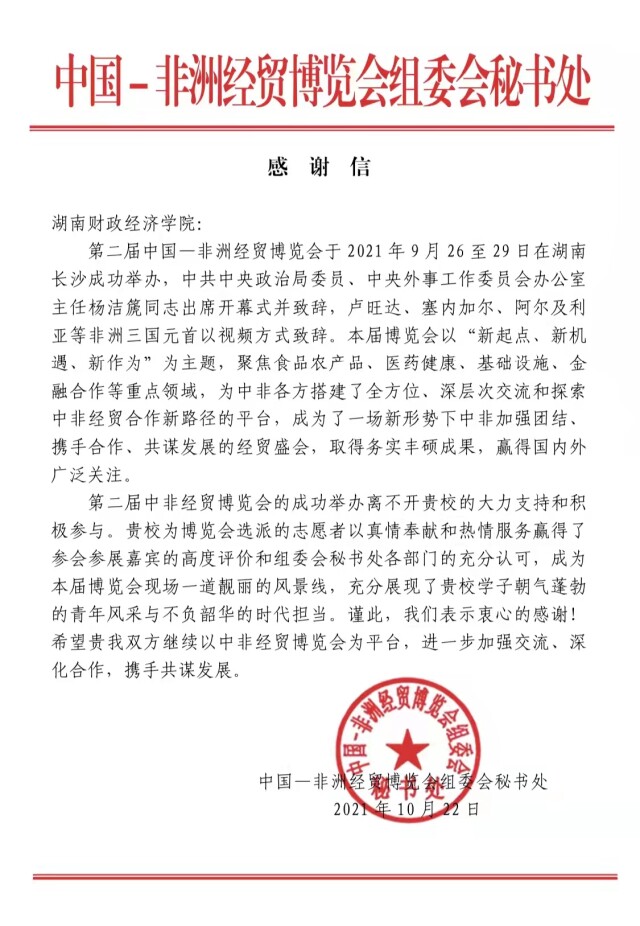 新湖南客户端11月16日讯(通讯员 黄越 虞灿 )11月4日,best365中国官方网站收到第二届中国—非洲经贸博览会组委会秘书处发来的感谢信,信中对best365中国官方网站学生志愿者在中非经贸博览会中的热情服务和真情奉献提...