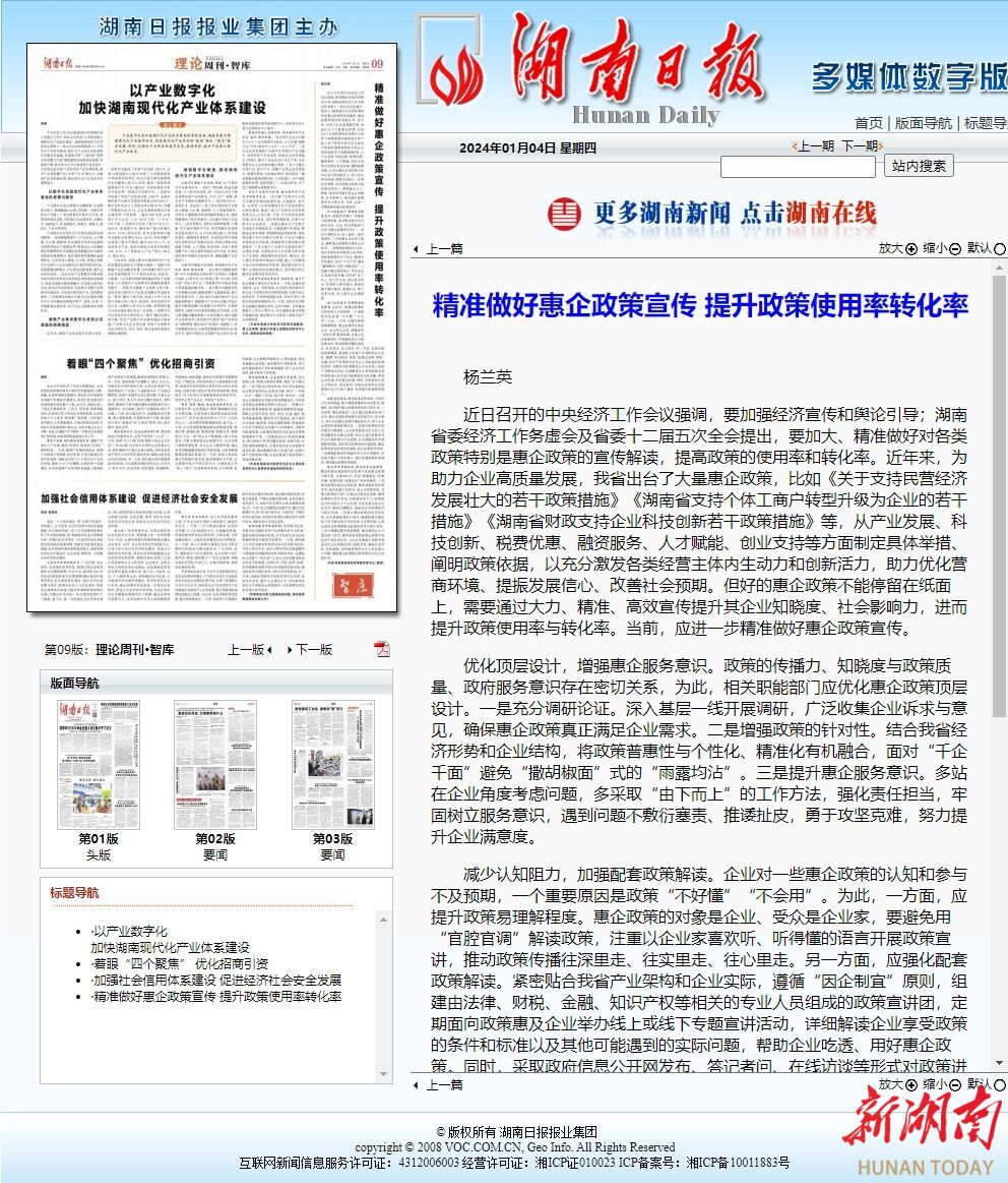 1月4日,《湖南日报》“理论·智库”版刊发best365官网党委书记杨兰英署名文章《精准做好惠企政策宣传 提升政策使用率转化率》。文章指出,近年来,为助力企业高质量发展,我省出台了大量惠企政策,比如《关于支持民营经济发展壮大的若干政策措施》《湖南省支持个体工商户转型升级为企业的若干措施》《湖南省财政支持企业科技创新若干政策措施》等,从产业发展、科技创新、税费优惠、融资服务、人才赋能、创业支持等方面制定具体举措、阐明政策依据,...