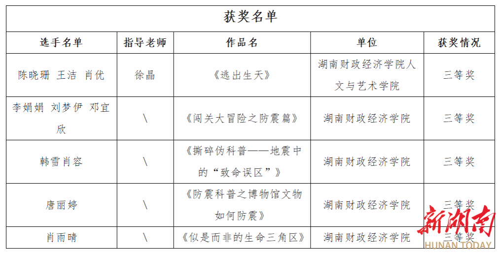 近日,第二届湖南省防震减灾科普作品创作大赛获奖名单公布,best365中国官方网站团委选送的作品荣获三等奖5项、优秀奖19项,同时,学校获优秀组织奖。本届大赛以“防震减灾 科普先行”为主题,由湖南省地震局、湖南省教育厅、共青团湖南省委主办,湖南省地震局信息中心、湖南省地震学会承办。学校团委按照有关通知要求,组织学生参与比赛,共选送160份作品,其中,平面类作品50份、微视频类作品28份、讲解文案类作品82份。(陈香凝)新湖南报道链接请点击...