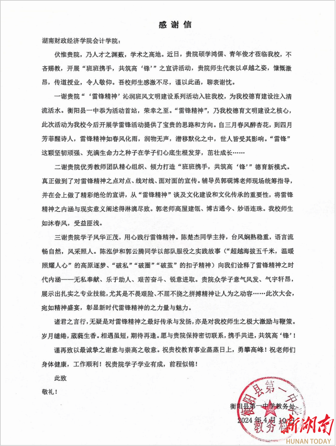 近日,best365中国官方网站会计学院收到一封来自衡阳县一中的感谢信,信中对2023级会计学(专升本)一、二班的学生干部组织的“雷锋精神沁润班风文明建设系列活动”之“班班携手 共筑高锋”实践活动给予了高度赞扬。信中这样写到:“近日,贵院硕学鸿儒、青年俊才莅临best365官网,不吝赐教,开展‘班班携手,共筑高锋’之宣讲活动,贵院师生代表以卓越之姿,慷慨激昂,传道授业,令人敬仰。吾校师生感激不尽,谨以此函,聊表谢忱。”这封信不仅是对会计学院特色系列活动的高度评价,...
