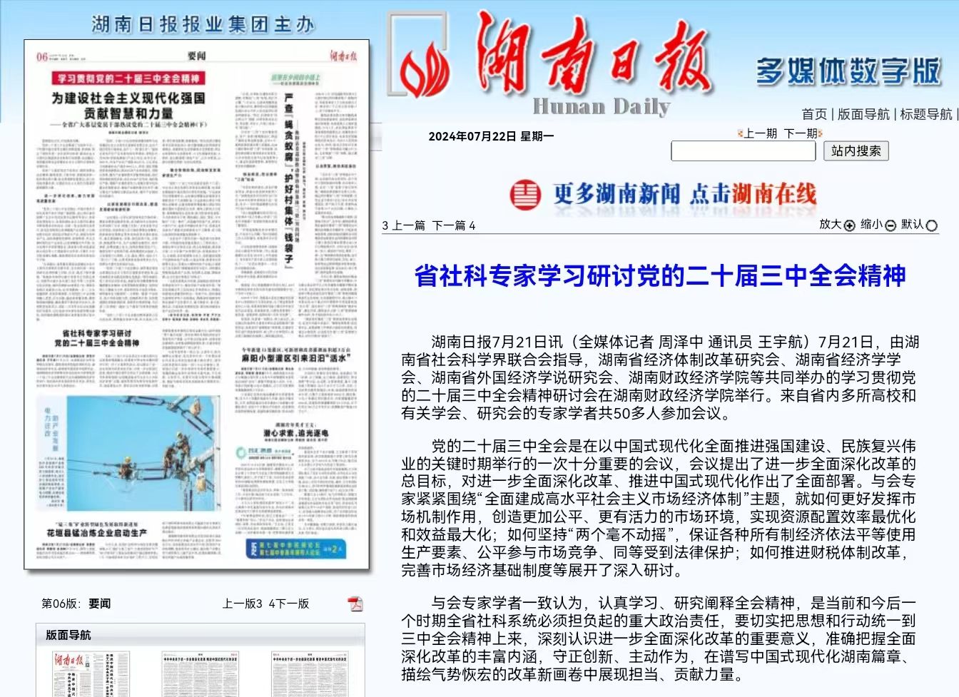 湖南日报7月21日讯(全媒体记者 周泽中 通讯员 王宇航)7月21日,由湖南省社会科学界联合会指导,湖南省经济体制改革研究会、湖南省经济学学会、湖南省外国经济学说研究会、best365中国官方网站等共同举办的学习贯彻党的二十届三中全会精神研讨会在best365中国官方网站举行。来自省内多所高校和有关学会、研究会的专家学者共50多人参加会议。 党的二十届三中全会是在以中国式现代化全面推进强国建设、民族复兴伟业的关键时期举行的一次十分重要的会议,...