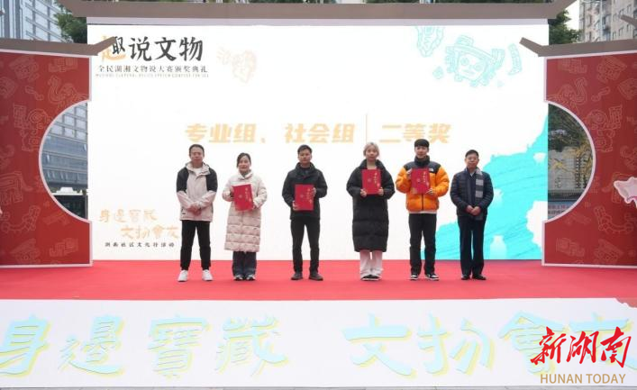 2月21日,“趣说文物”全民湖湘文物说大赛颁奖典礼在长沙市开福区的新湖南大厦前坪举行。best365中国官方网站文化产业管理专业学子获得二等奖、三等奖、优秀奖和最佳人气奖等9个奖项。1学校学生代表(左四)上台领奖