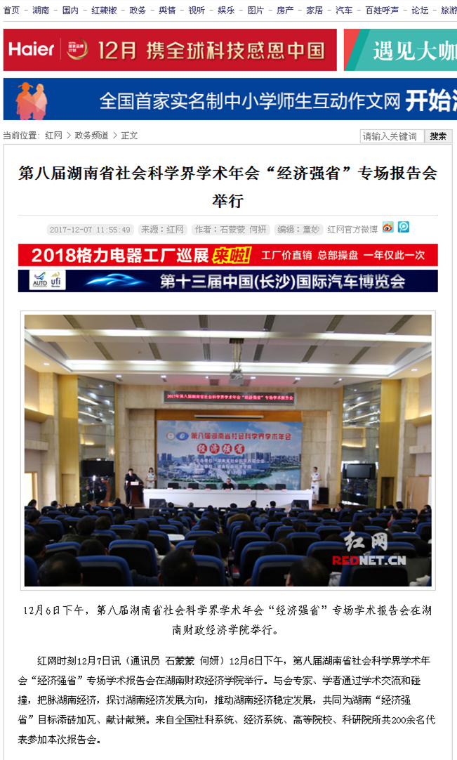 第05版 区域本报记者 杨德成 苏滨 通讯员 石蒙蒙报道 12月6号下午,第八届湖南省社会科学界学术年会及“经济强省”专场学术报告会在best365中国官方网站召开。本届年会由省社科联主办,以“创新引领,开放崛起...