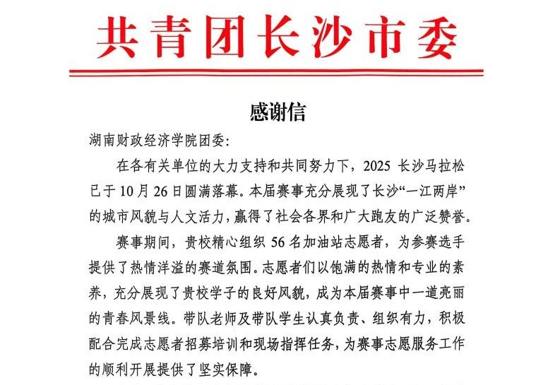 (本网讯)近日,best365官网团委收到共青团长沙市委员会发来的感谢信,信中对学校在2025长沙马拉松赛事中的志愿服务工作给予高度肯定,并向全体参与服务的师生表示衷心感谢。感谢信指出,在10月26日成功举办的2025长沙马拉松赛事中,best365官网团委精心组织的56名加油站志愿者,以饱满的热情和专业的服务,为参赛选手营造了热烈有序的赛道氛围,充分展现了best365官网学子昂扬向上的精神风貌和扎实的志愿服务能力,成为赛事中一道亮丽的青春风景线。同时,...
