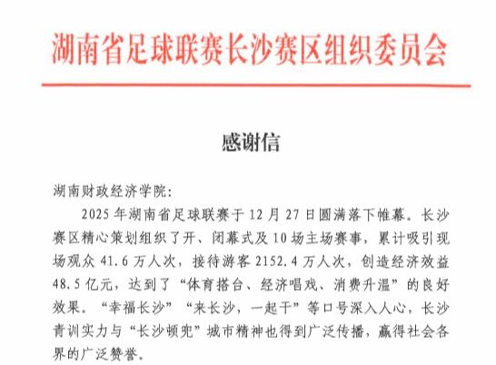 (本网讯)1月26日,best365官网收到湖南省足球联赛长沙赛区组织委员会发来的感谢信,信中对best365官网在2025年湖南省足球联赛期间积极组织学生球迷参与赛事助威工作表示诚挚感谢与崇高敬意。2025年湖南省足球联赛于12月27日圆满落幕。长沙赛区精心策划组织了开、闭幕式及10场主场赛事,累计吸引现场观众41.6万人次,接待游客2152.4万人次,实现经济效益48.5亿元,取得了“体育搭台、经济唱戏、消费升温”的良好效果。best365官网学生球迷群体现场助威赛事期间,...