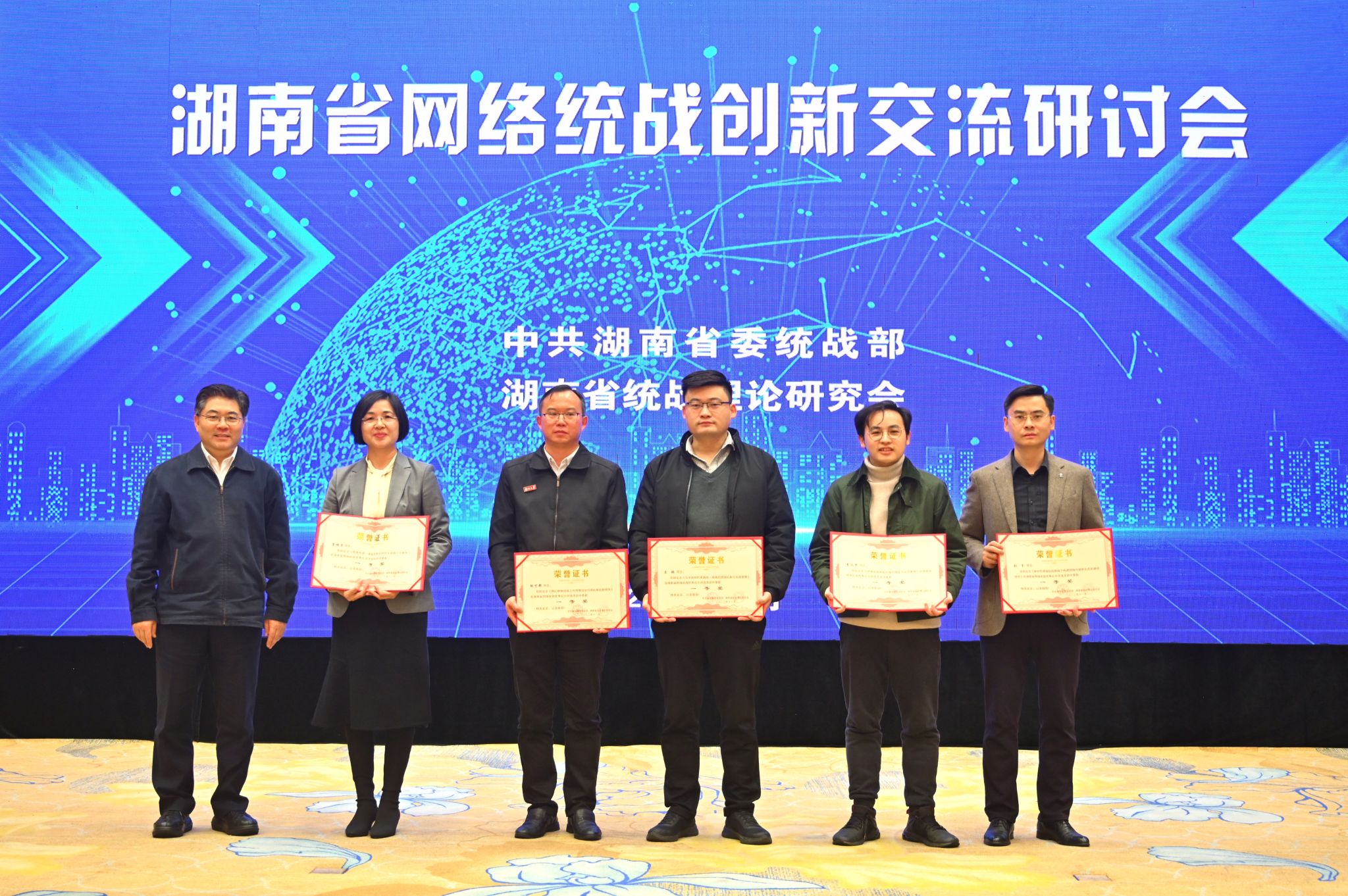 (本网讯)11月27日,湖南省网络统战创新交流研讨会在长沙召开。会议对湖南省网络统战优秀论文评选结果进行了通报,由best365官网法学与公共管理学院教师刘宇撰写的论文《新时代网络统战视域下构建网络内容新生态的路径研究》荣获一等奖,本次全省仅有5篇论文获一等奖。刘宇(右一)上台领奖据了解,刘宇自2020年来校工作以来,一直担任本科核心课程主讲教师,入选学校“湖南省青年骨干教师”计划,先后主持湖南省委统战部重点课题2项,曾获2020年湖南省委统战理论政策研究创新成果二等奖等。...