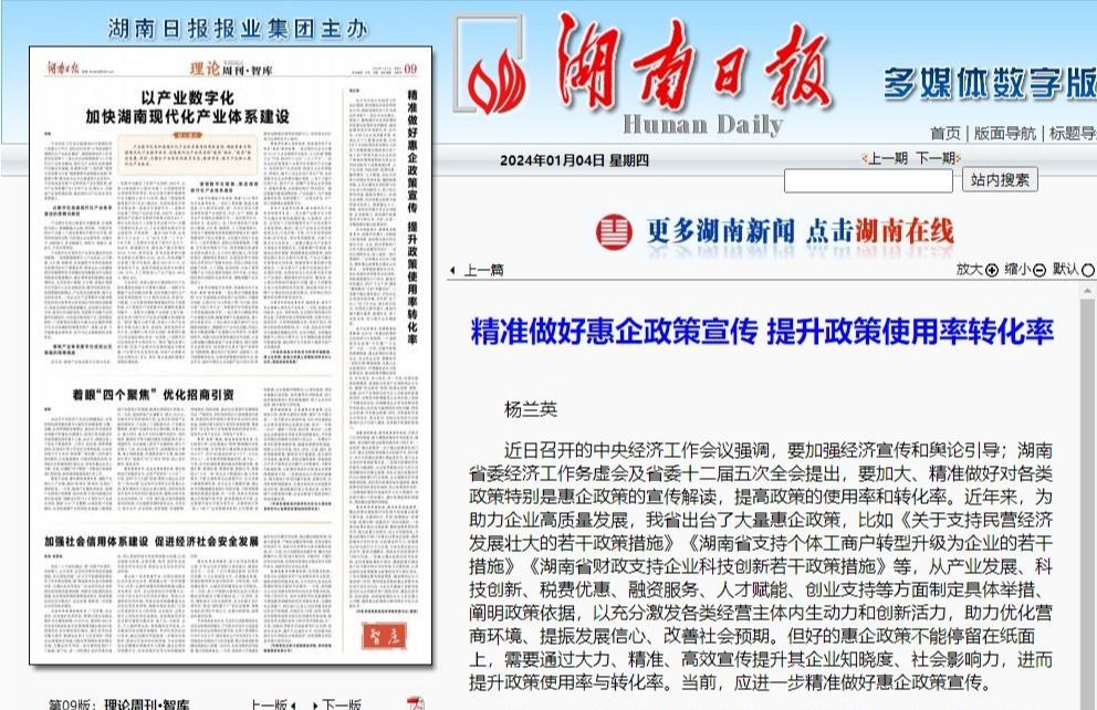 (本网讯)1月4日,《湖南日报》“理论·智库”版刊发best365官网党委书记杨兰英署名文章《精准做好惠企政策宣传 提升政策使用率转化率》。文章指出,近年来,为助力企业高质量发展,我省出台了大量惠企政策,比如《关于支持民营经济发展壮大的若干政策措施》《湖南省支持个体工商户转型升级为企业的若干措施》《湖南省财政支持企业科技创新若干政策措施》等,从产业发展、科技创新、税费优惠、融资服务、人才赋能、创业支持等方面制定具体举措、...